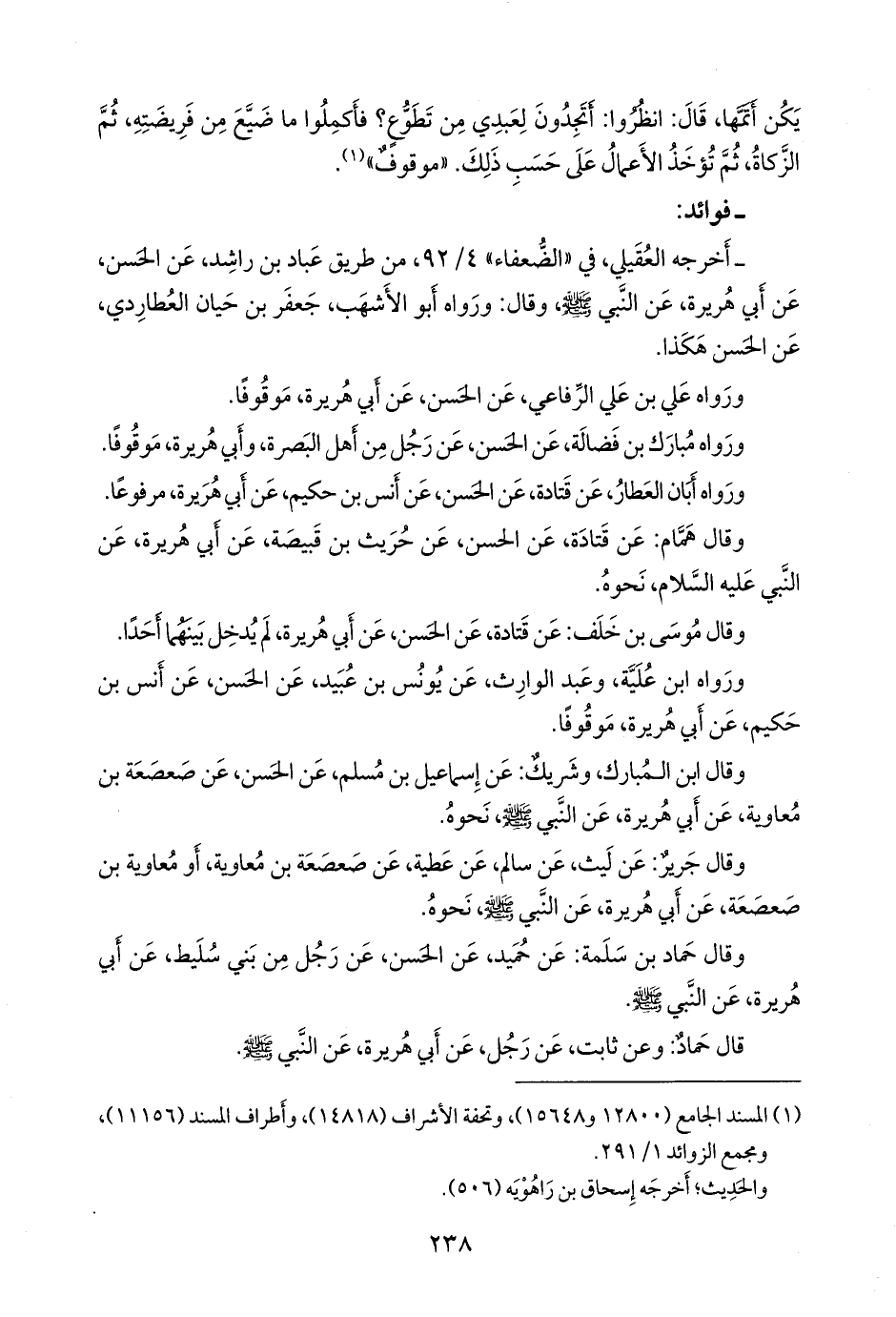 - أخرجه العُقيلي في «الضعفاء» ٤/ ٩٢، من طريق عباد بن راشد، عن الحسن، عن أبي هريرة، عن النبي صَلى الله عَليه وسَلم وقال: ورواه أَبو الأشهب, جعفر بن حيان العطاردي، عن الحسن هكذا.