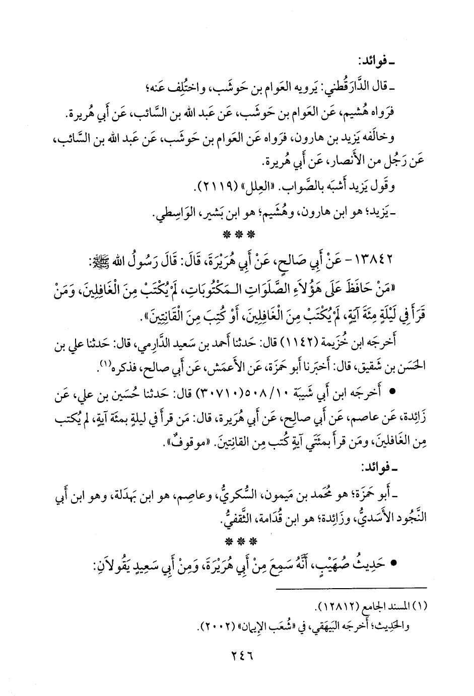 • أَخرجه ابن أبي شيبة (٣٠٧١٠) قال: حدثنا حسين بن علي، عن زائدة، عن عاصم، عن أبي صالح، عن أبي هريرة، قال: من قرأ في ليلة بمئة آية، لم يكتب من الغافلين، ومن قرأ بمئتي آية كتب من القانتين. «موقوف».