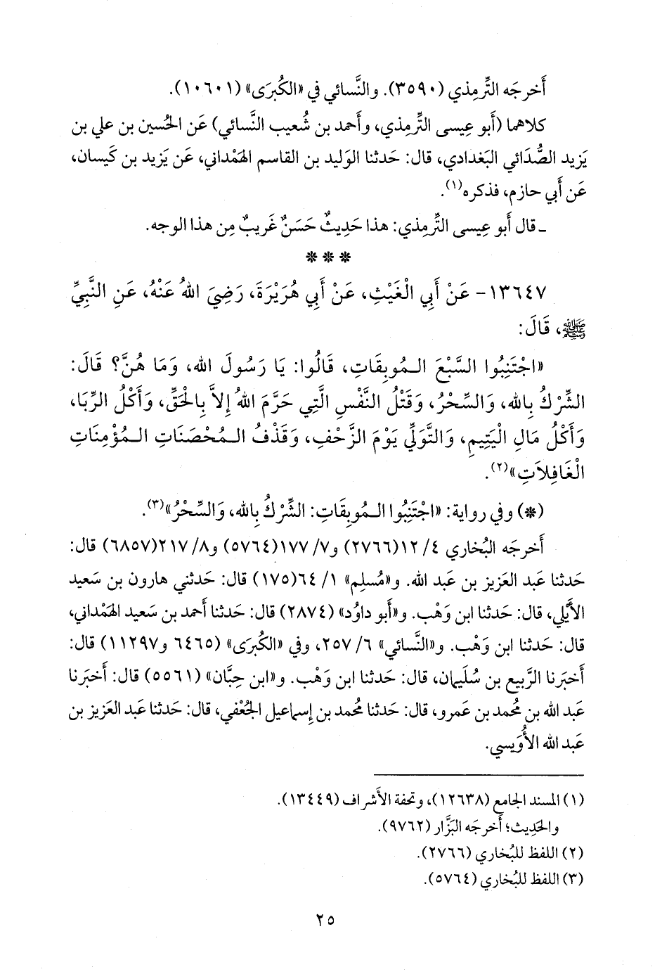 - وفي رواية: «اجتنبوا الموبقات: الشرك بالله، والسحر» (¬٢).