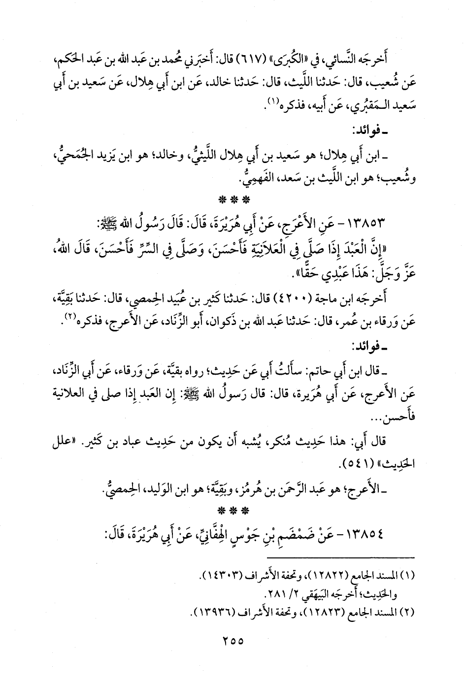 - قال عبد الرَّحمَن بن أبي حاتم الرازي: سألتُ أبي عن حديثٍ؛ رواه بقية، عن ورقاء، عن أبي الزناد، عن الأعرج، عن أبي هريرة، قال: قال رسول الله صَلى الله عَليه وسَلم: إن العبد إذا صلى في العلانية فأحسن ...