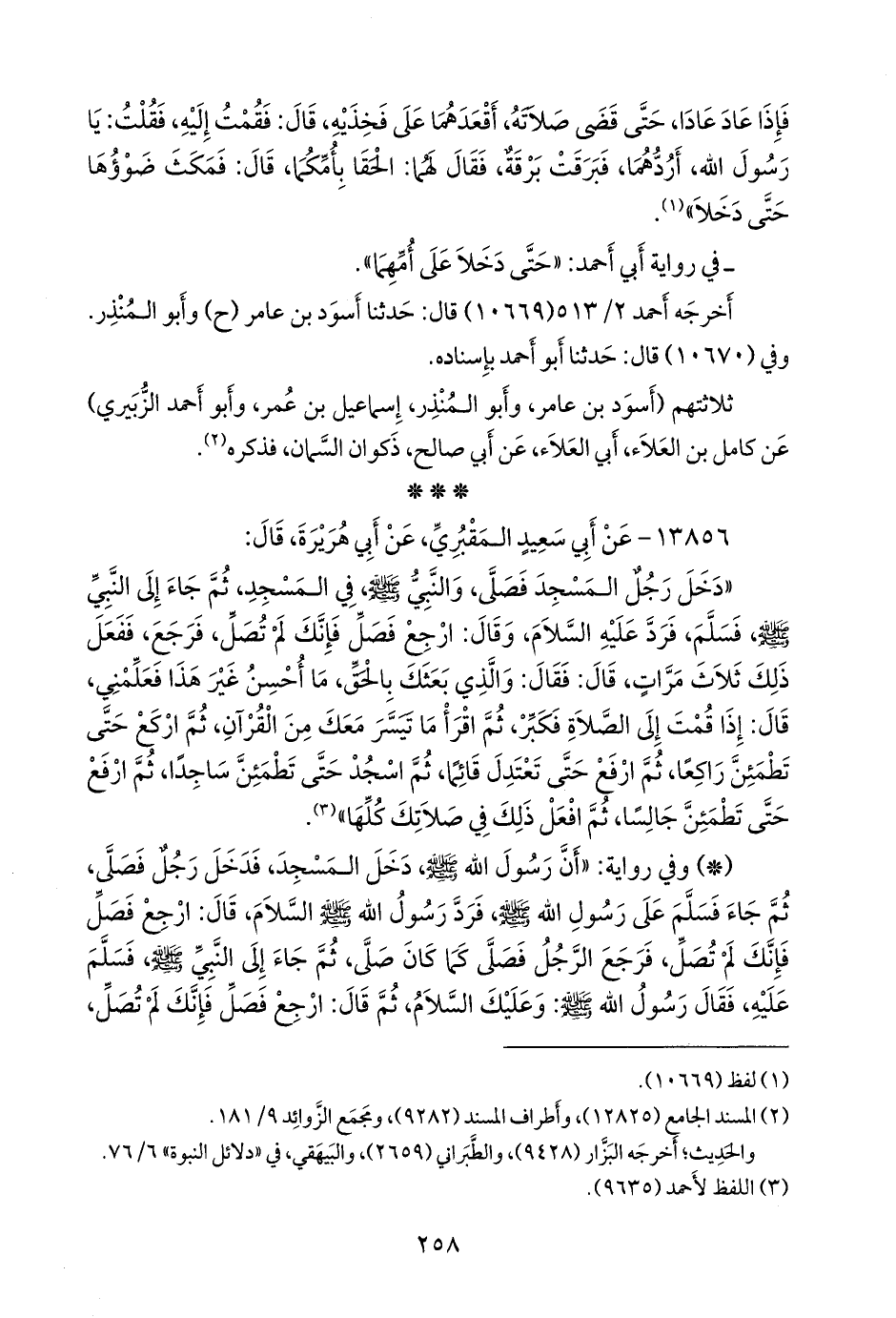 - وفي رواية: «أن رسول الله صَلى الله عَليه وسَلم دخل المسجد، فدخل رجل فصلى، ثم جاء فسلم على رسول الله صَلى الله عَليه وسَلم فرد رسول الله صَلى الله عَليه وسَلم السلام، قال: ارجع فصل فإنك لم تصل، فرجع الرجل فصلى كما كان صلى، ثم جاء إلى النبي صَلى الله عَليه وسَلم فسلم عليه، فقال رسول الله صَلى الله عَليه وسَلم: وعليك السلام، ثم قال: ارجع فصل فإنك لم تصل،