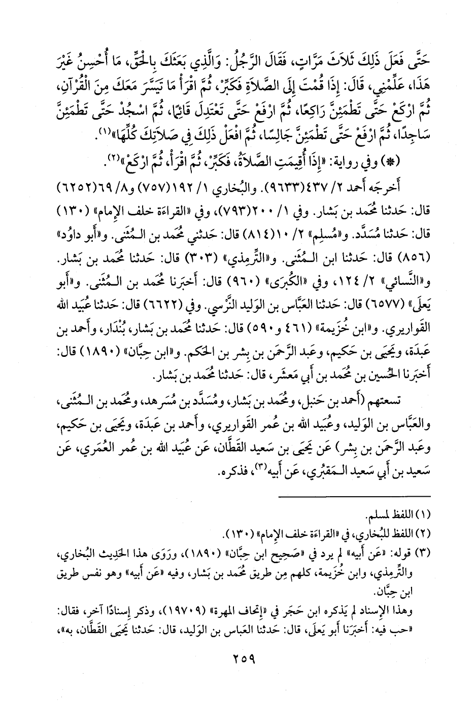أخرجه أحمد (٩٦٣٣). والبخاري (٧٥٧ و ٦٢٥٢) قال: حدثنا محمد بن بشار. وفي (٧٩٣)، وفي «القراءة خلف الإمام» (١٣٠) قال: حدثنا مُسدد. و «مسلم» ٢/ ١٠ (٨١٤) قال: حدثني محمد بن المثنى. و «أَبو داود» (٨٥٦) قال: حدثنا ابن المثنى. و «التِّرمِذي» (٣٠٣) قال: حدثنا محمد بن بشار. و «النَّسَائي» ٢/ ١٢٤، وفي «الكبرى» (٩٦٠) قال: أخبرنا محمد بن المثنى. و «أَبو يَعلى» (٦٥٧٧) قال: حدثنا العباس بن الوليد النَّرْسي. وفي (٦٦٢٢) قال: حدثنا عُبيد الله القواريري. و «ابن خزيمة» (٤٦١ و ٥٩٠) قال: حدثنا محمد بن بشار، بُندَار، وأحمد بن عَبدة، ويحيى بن حكيم، وعبد الرَّحمَن بن بشر بن الحكم.