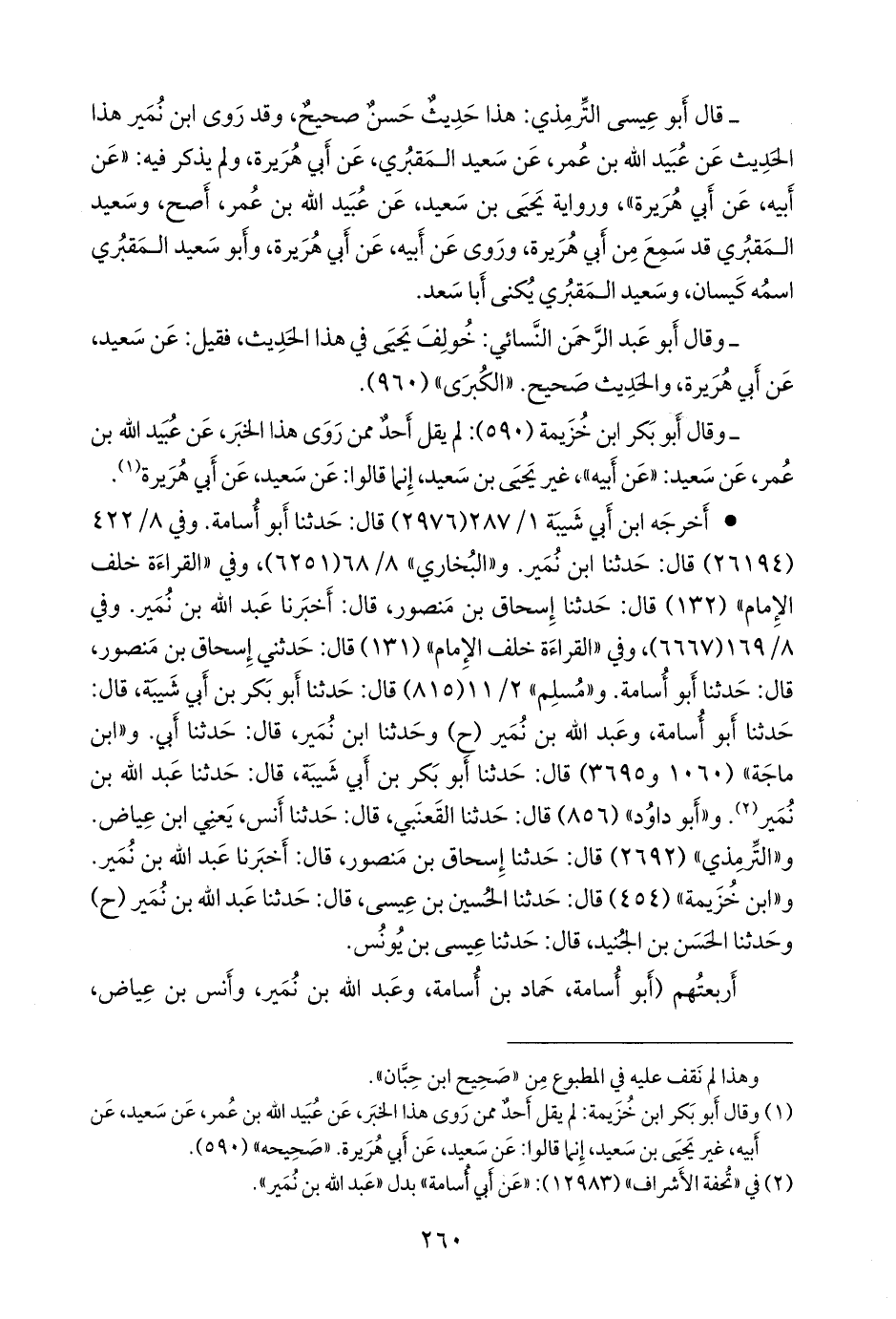 - قال ابن خزيمة: لم يقل أحد ممن روى هذا الخبر، عن عُبيد الله بن عمر، عن سعيد، عن أبيه، غير يحيى بن سعيد، إنما قالوا: عن سعيد، عن أبي هريرة. «صحيحه» (٥٩٠).