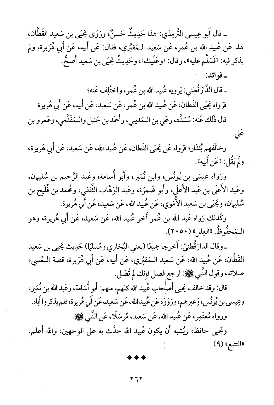 - وقال الدارقُطني: أخرجا جميعا (يعني البخاري ومسلما) حديث يحيى بن سعيد القطان، عن عُبيد الله، عن سعيد المَقبُري، عن أبيه، عن أبي هريرة، قصة المسيء صلاته، وقول النبي صَلى الله عَليه وسَلم: ارجع فصل فإنك لم تصل.