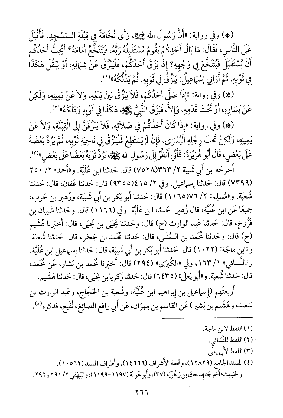 - وفي رواية: «إذا كان أحدكم في صلاته، فلا يبزقن إلى القبلة، ولا عن يمينه، ولكن تحت رجله اليسرى، فإن لم يستطع فليبزق في ناحية ثوبه، ولْيَرُدَّ بعضه على بعض، قال أَبو هريرة: كأني أنظر إلى رسول الله صَلى الله عَليه وسَلم يرد ثوبه بعضا على بعض» (¬١).