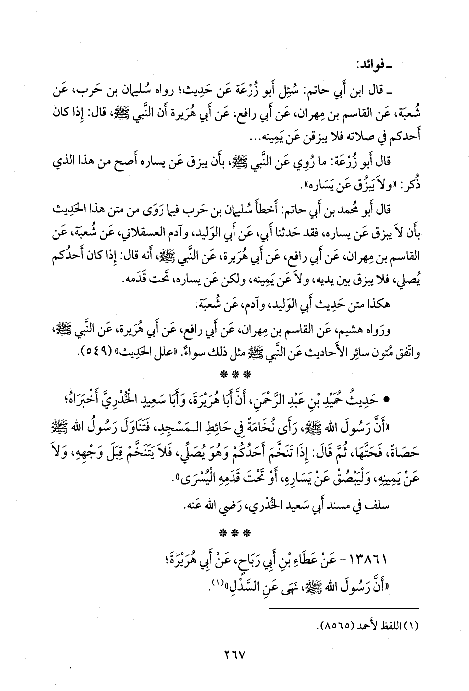 قال أَبو محمد بن أبي حاتم: أخطأ سليمان بن حرب فيما روى من متن هذا الحديث بأن لا يَبزُق عن يساره.