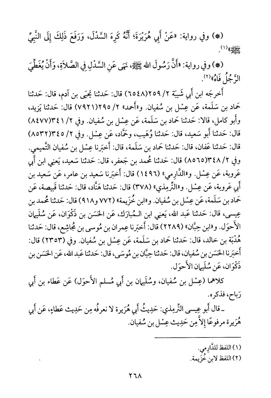 و «التِّرمِذي» (٣٧٨) قال: حدثنا هَنَّاد، قال: حدثنا قَبيصَة، عن حماد بن سلمة، عن عسل بن سفيان. و «ابن خزيمة» (٧٧٢ و ٩١٨) قال: حدثنا محمد بن عيسى، قال: حدثنا عبد الله، يعني ابن المبارك، عن الحسن بن ذكوان، عن سليمان الأحول. و «ابن حِبَّان» (٢٢٨٩) قال: أخبرنا عمران بن موسى بن مجاشع، قال: حدثنا هُدبة بن خالد، قال: حدثنا حماد بن سلمة، عن عسل بن سفيان. وفي (٢٣٥٣) قال: أخبرنا الحسن بن سفيان، قال: حدثنا حِبَّان بن موسى، قال: حدثنا عبد الله، عن الحسن بن ذكوان، عن سليمان الأحول.