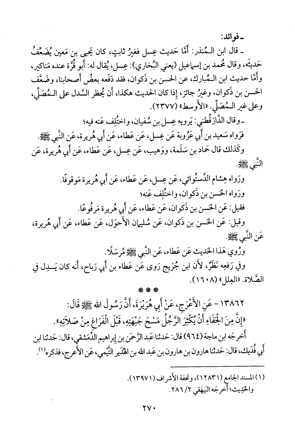 «إن من الجفاء أن يكثر الرجل مسح جبهته، قبل الفراغ من صلاته».