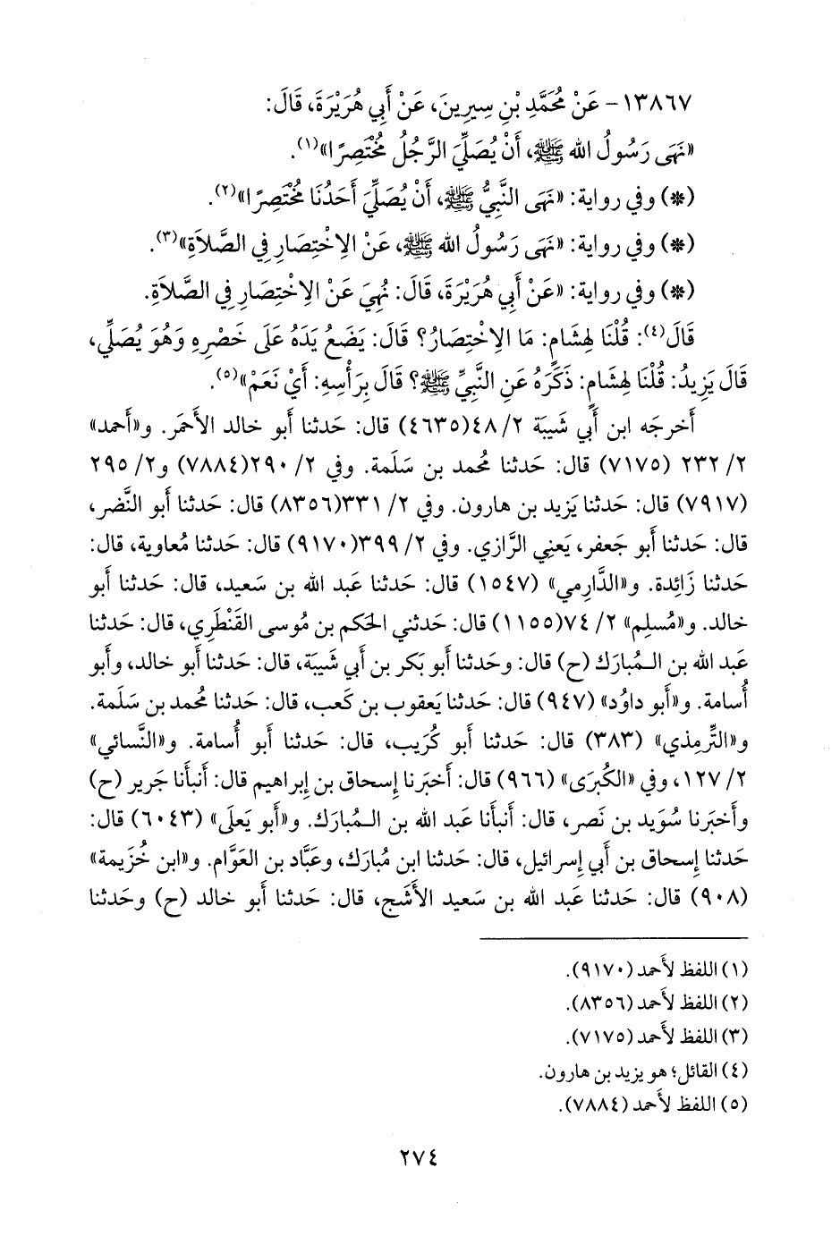 - وفي رواية: «نهى رسول الله صَلى الله عَليه وسَلم عن الاختصار في الصلاة» (¬٣).