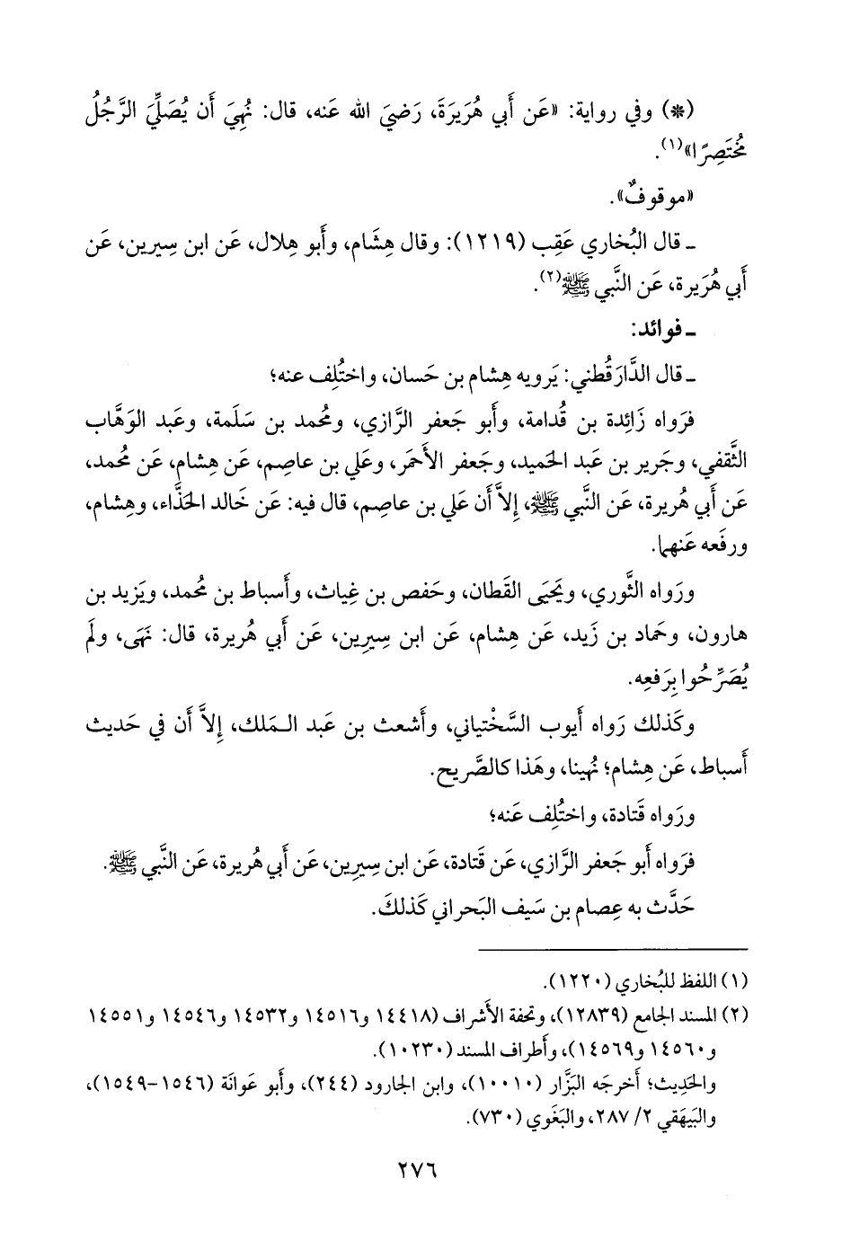 ورواه الثوري، ويحيى القطان، وحفص بن غياث، وأسباط بن محمد، ويزيد بن هارون، وحماد بن زيد، عن هشام، عن ابن سِيرين، عن أبي هريرة، قال: نهى، ولم يصرحوا برفعه.