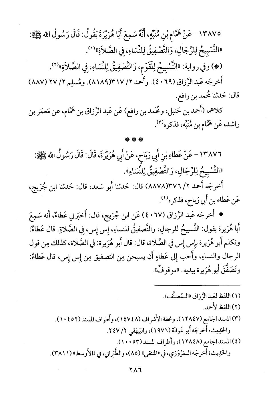 • أَخرجه عبد الرزاق (٤٠٦٧) عن ابن جُريج، قال: أَخبرني عطاء، أَنه سمع أَبا هريرة يقول: التسبيح للرجال، والتصفيق للنساء، إِسْ إِسْ في الصلاة.