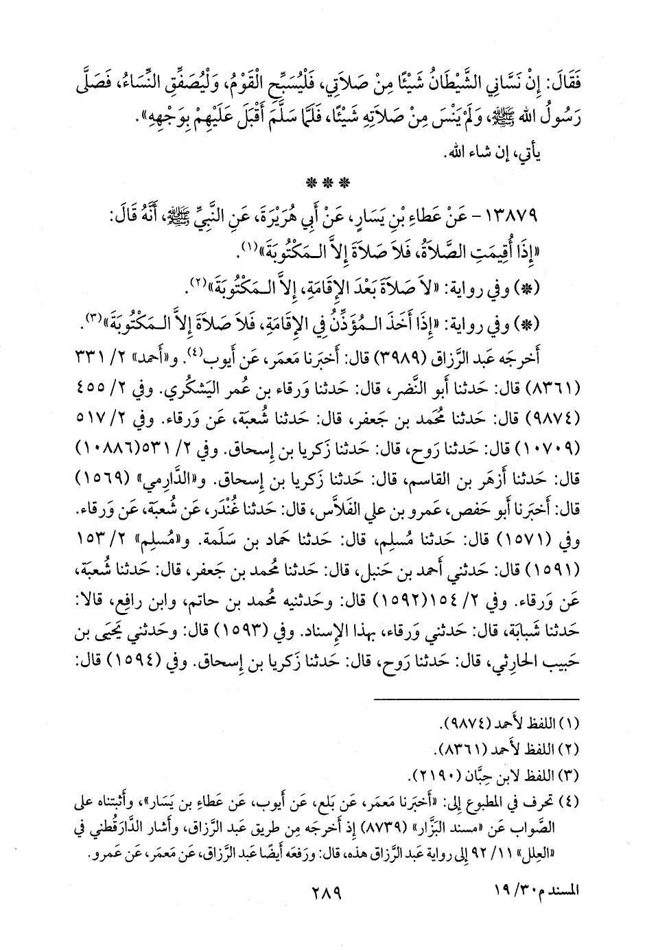 (¬٤) وقع خلل في إسناد هذا الحديث في النسخ الخطية كما ذكر محققو طبعات المجلس العلمي والكتب العلمية والتأصيل لـ «مُصَنَّف عبد الرزاق»، وسقط من هذه الطبعات قول أيوب: «عن عَمرو بن دينار».