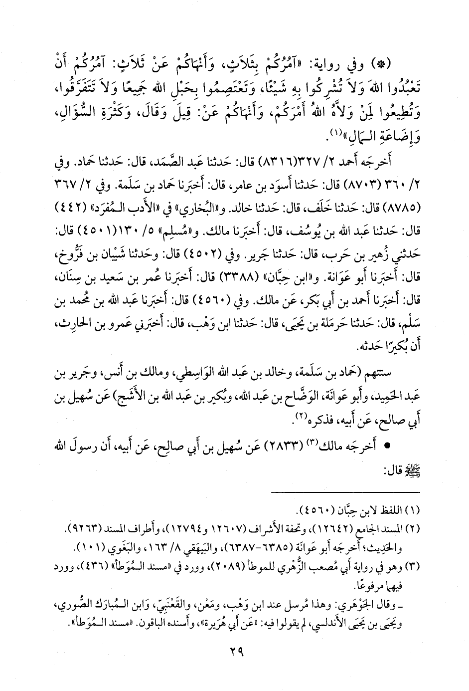 «إن الله يرضى لكم ثلاثا، ويسخط لكم ثلاثا: يرضى لكم أن تعبدوه، ولا تشركوا به شيئا، وأن تعتصموا بحبل الله جميعا، وأن تناصحوا من ولاه الله أمركم، ويسخط لكم: قيل وقال، وإضاعة المال، وكثرة السؤال». «مُرسَل» (¬٣).