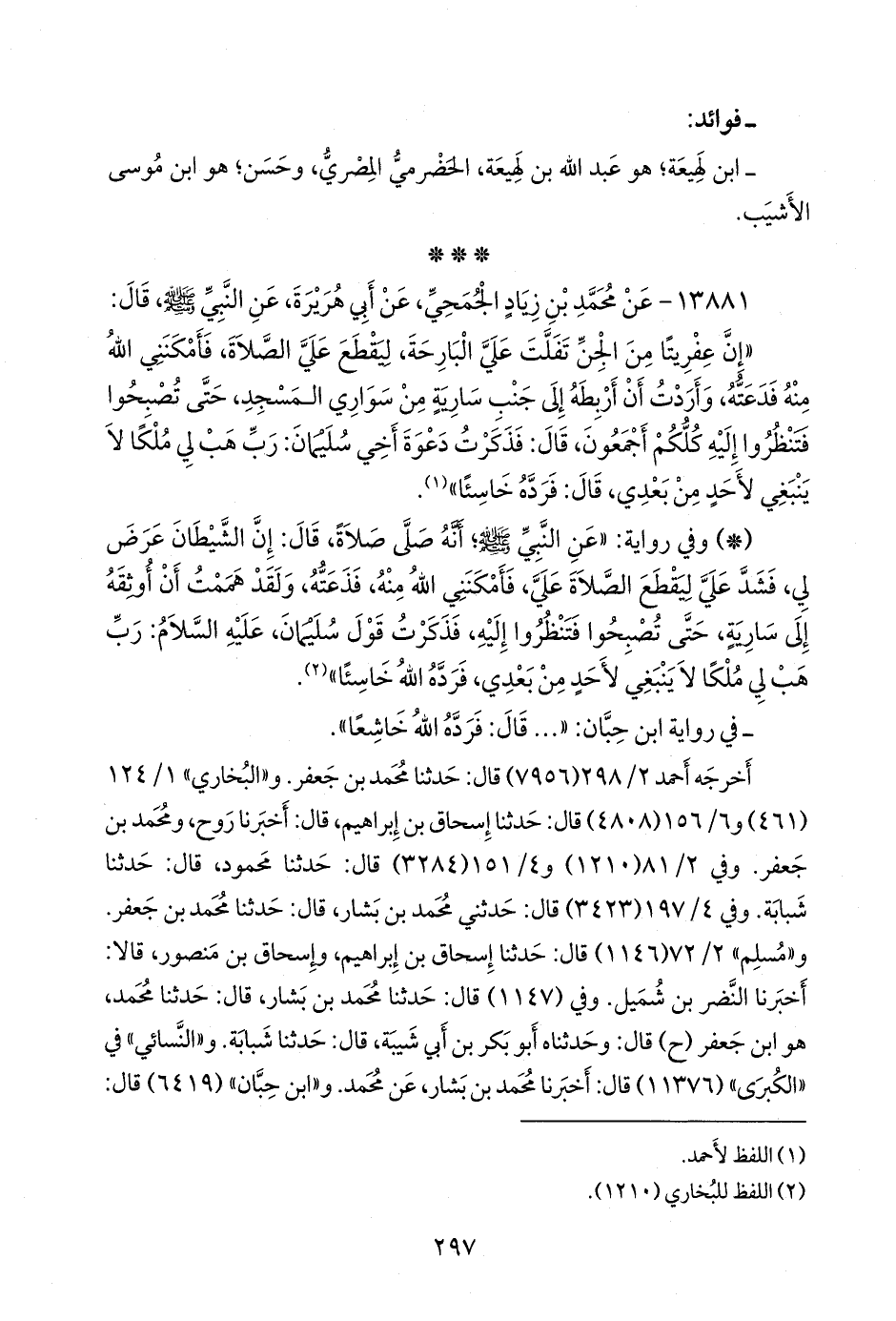 - وفي رواية: «عن النبي صَلى الله عَليه وسَلم؛ أنه صلى صلاة، قال: إن الشيطان عرض لي، فشد علي ليقطع الصلاة علي، فأمكنني الله منه، فذعته، ولقد هممت أن أوثقه إلى سارية، حتى تصبحوا فتنظروا إليه، فذكرت قول سليمان، عليه السلام: رب هب لي ملكا لا ينبغي لأحد من بعدي، فرده الله خاسئا» (¬٢).