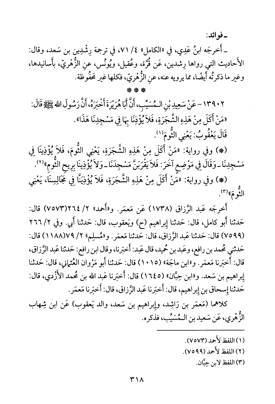 «من أكل من هذه الشجرة، فلا يقرب مساجدنا، يؤذينا بريح الثوم». «مُرسَل» (¬٢).