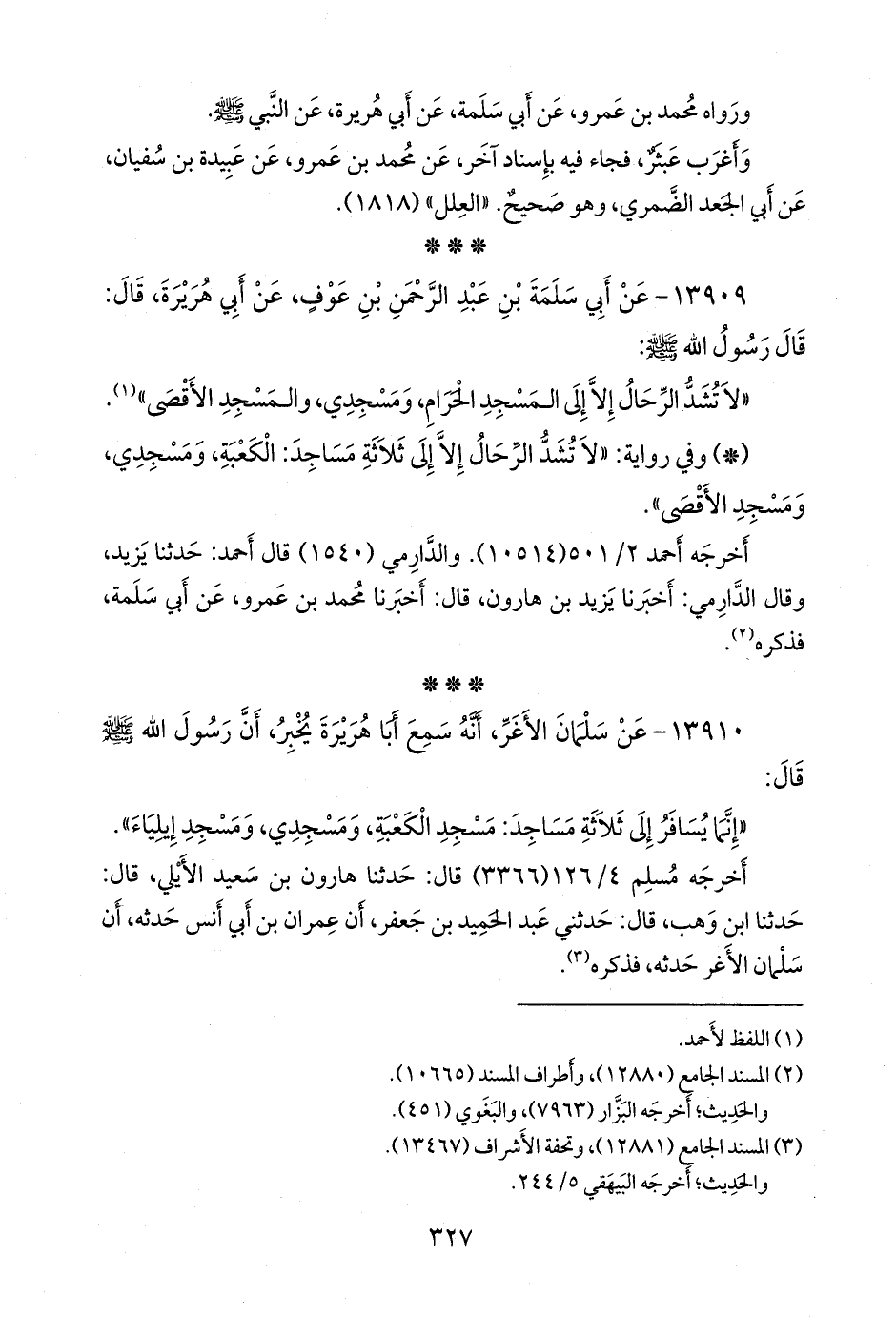 - وفي رواية: «لا تشد الرحال إلا إلى ثلاثة مساجد: الكعبة، ومسجدي، ومسجد الأقصى».