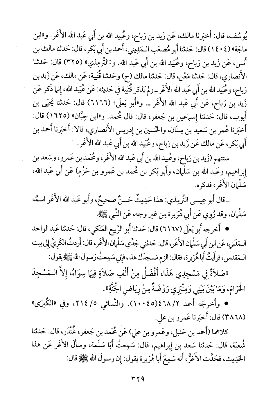 • أَخرجه أَبو يَعلى (٦١٨٧) قال: حدثنا أَبو الربيع العتكي، قال: حدثنا عبد الواحد المدني، عن ابن ابن سلمان الأغر، قال: حدثني جدي سلمان الأغر، قال: أردت الكري إلى بيت المقدس، فرأيت أبا هريرة، فقال: الزم مسجدك هذا، فإني سمعت رسول الله صَلى الله عَليه وسَلم يقول: