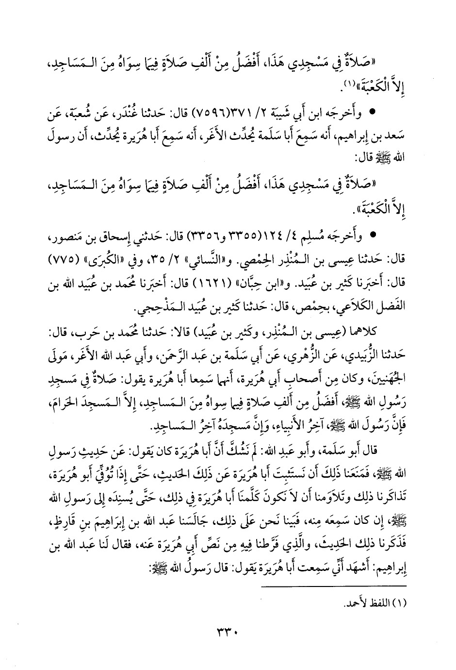 كلاهما (عيسى بن المنذر، وكثير بن عبيد) عن محمد بن حرب، قال: حدثنا الزبيدي، عن الزُّهْري، عن أبي سلمة بن عبد الرَّحمَن، وأبي عبد الله الأغر مولى الجهنيين، وكان من أصحاب أبي هريرة، أنهما سمعا أبا هريرة يقول: صلاة في مسجد رسول الله صَلى الله عَليه وسَلم أفضل من ألف صلاة فيما سواه من المساجد، إلا المسجد الحرام، فإن رسول الله صَلى الله عَليه وسَلم آخر الأنبياء، وإن مسجده آخر المساجد.