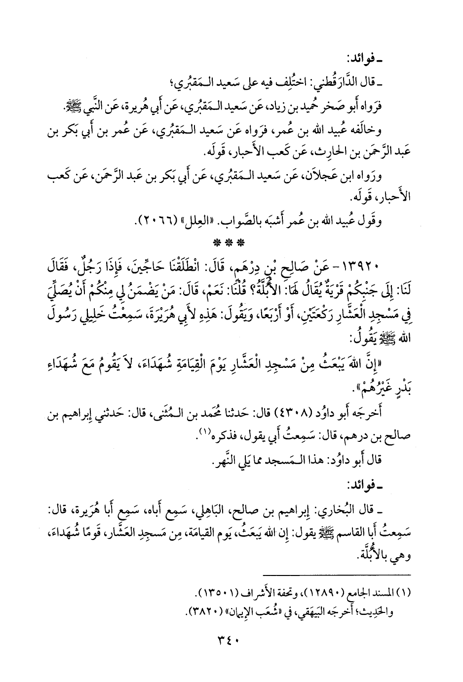 - قلنا: إِسناده ضعيفٌ؛ قال البخاري: إبراهيم بن صالح، الباهلي، سمع أباه، سمع أبا هريرة، قال: سمعت أبا القاسم صَلى الله عَليه وسَلم يقول: إن الله يبعث، يوم القيامة، من مسجد العشار، قوما شهداء، وهي بالأبلة.