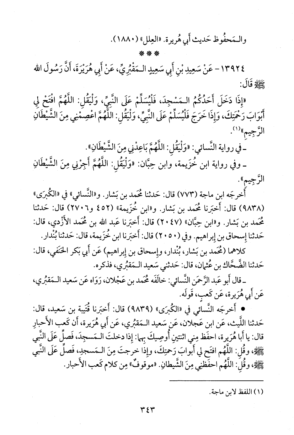 • أَخرجه النَّسَائي في «الكبرى» (٩٨٣٩) قال: أخبرنا قتيبة بن سعيد، قال: حدثنا الليث، عن ابن عَجلان، عن سعيد المَقبُري، عن أبي هريرة، أن كعب الأحبار قال: يا أبا هريرة، احفظ مني اثنتين أوصيك بهما: إذا دخلت المسجد، فصل على النبي صَلى الله عَليه وسَلم وقل: اللهم افتح لي أَبواب رحمتك، وإذا خرجت من المسجد، فصل على النبي صَلى الله عَليه وسَلم وقل: اللهم احفظني من الشيطان. «موقوف» من كلام كعب الأحبار.