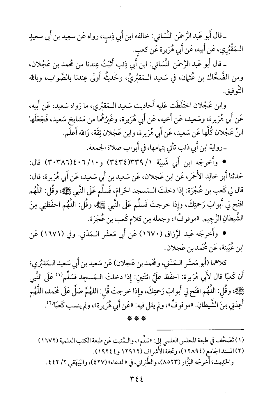 كلاهما (أَبو معشر المدني، ومحمد بن عَجلان) عن سعيد بن أبي سعيد المَقبُري؛ أن كعبا قال لأبي هريرة: احفظ علي اثنتين: إذا دخلت المسجد فسلم (¬١) على النبي صَلى الله عَليه وسَلم وقل: اللهم افتح لي أَبواب رحمتك، وإذا خرجت قل: اللهم صل على محمد، اللهم أعذني من الشيطان. «موقوف»، ولم يقل فيه: «عن أبي هريرة»، ولم ينسب كعبا (¬٢).
