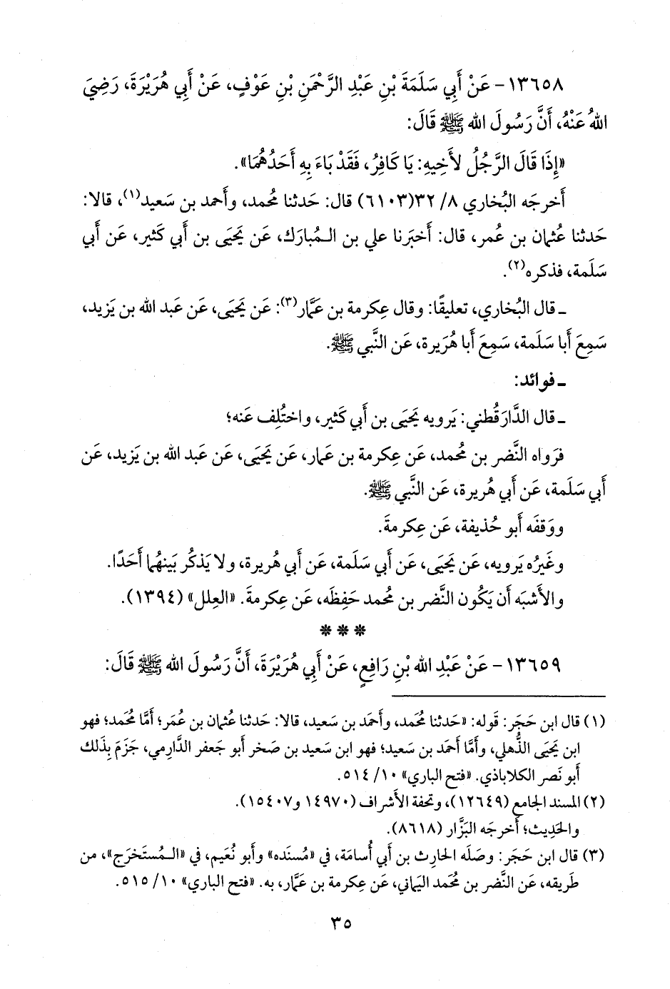 - وقال أَبو الحسن الدارقُطني أيضا: أخرج البخاري: حديث على بن المبارك، عن يحيى، عن أبي سلمة، عن أبي هريرة، أن النبي صَلى الله عَليه وسَلم قال: إذا قال الرجل لأخيه يا كافر، باء به أحدهما.