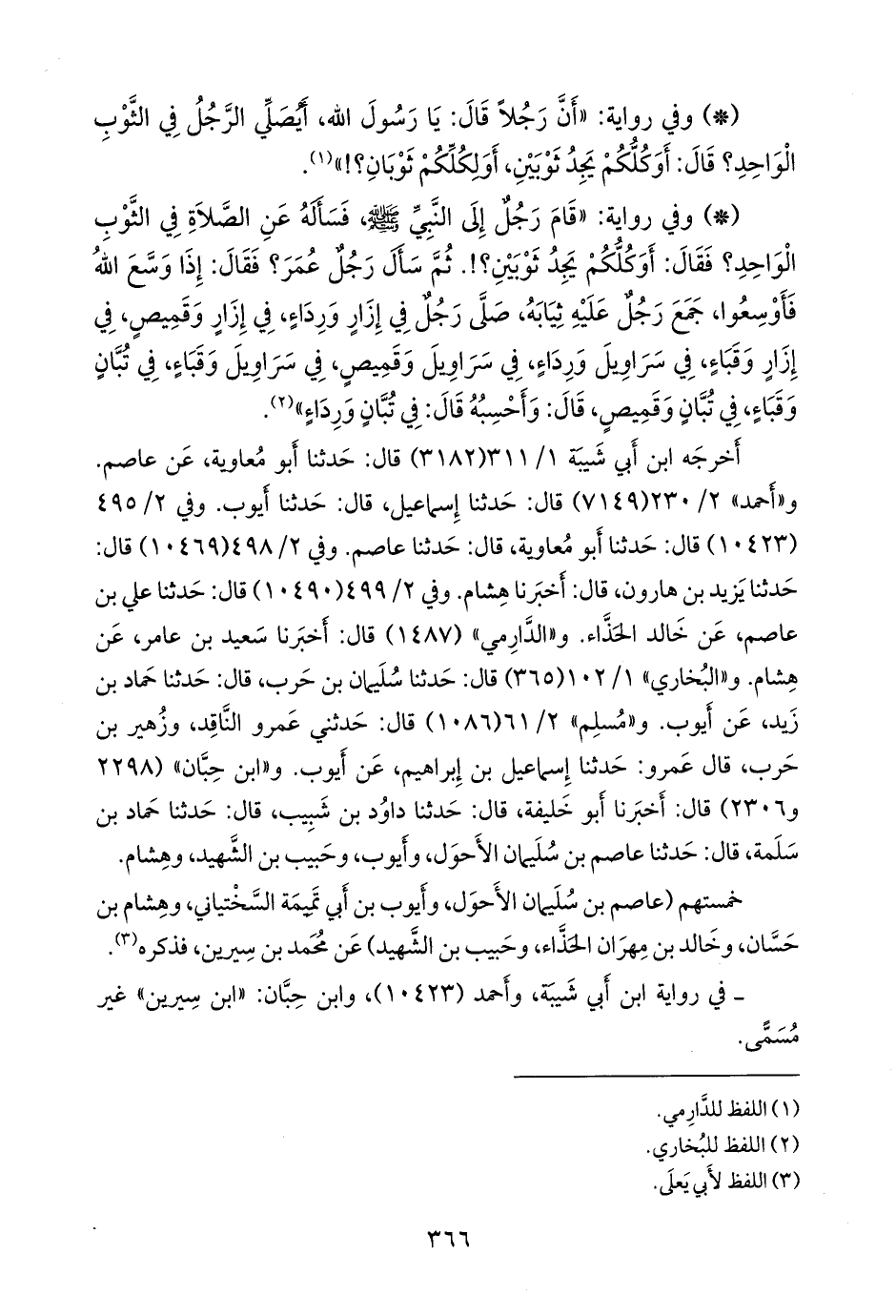 «نادى رجل رسول الله صَلى الله عَليه وسَلم: أيصلي أحدنا في ثوب واحد؟ قال: إذا وسع الله عليكم فأوسعوا على أنفسكم، جمع رجل عليه ثيابه، صلى رجل في إزار ورداء، في إزار وقميص، في سراويل وقباء، في سراويل ورداء، في تبان وقباء، قال: وأحسبه في تبان ورداء» (¬٢)
