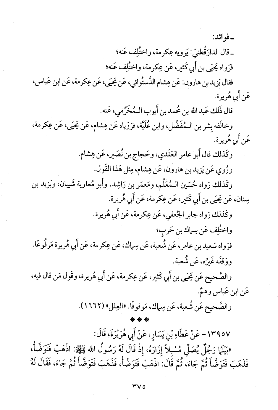 «بينما رجل يصلي مسبلا إزاره، إذ قال له رسول الله صَلى الله عَليه وسَلم: اذهب فتوضا، فذهب فتوضأ ثم جاء، ثم قال: اذهب فتوضا، فذهب فتوضأ ثم جاء، فقال له