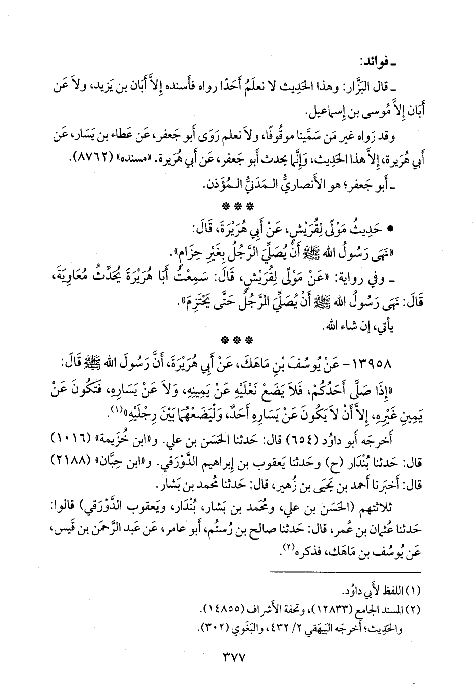 - وفي رواية: «عن مَولًى لقريش، قال: سمعت أبا هريرة يحدث معاوية، قال: نهى رسول الله صَلى الله عَليه وسَلم أن يصلي الرجل حتى يحتزم».
