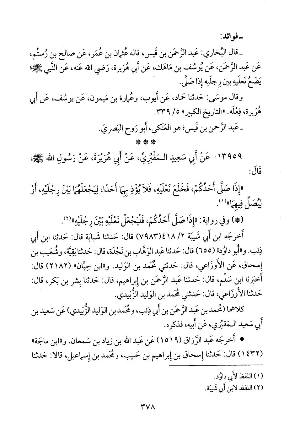 - وقال البخاري: عبد الرَّحمَن بن قيس، قاله عثمان بن عمر، عن صالح بن رستم، عن عبد الرَّحمَن، عن يوسف بن مَاهَك، عن أبي هريرة، رضي الله عنه، عن النبي صَلى الله عَليه وسَلم؛ يضع نعليه بين رجليه إذا صلى.