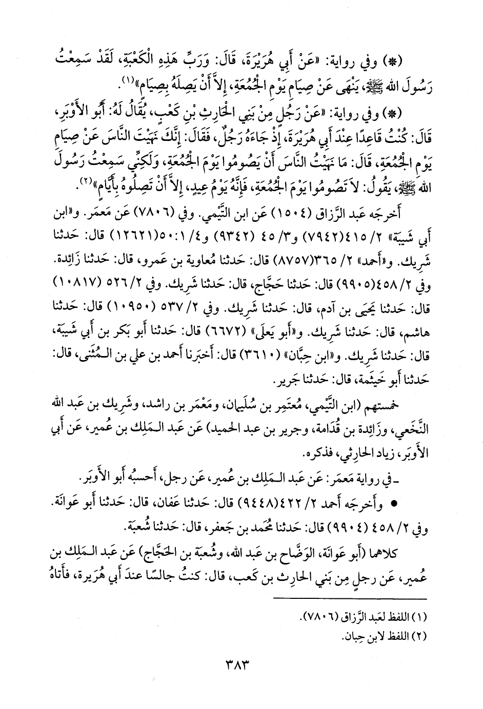 - وفي رواية: «عن رجل من بني الحارث بن كعب، يقال له: أَبو الأوبر، قال: كنت قاعدا عند أبي هريرة، إذ جاءه رجل، فقال: إنك نهيت الناس عن صيام يوم الجمعة، قال: ما نهيت الناس أن يصوموا يوم الجمعة، ولكني سمعت رسول الله صَلى الله عَليه وسَلم يقول: لا تصوموا يوم الجمعة، فإنه يوم عيد، إلا أن تصلوه بأيام» (¬١).
