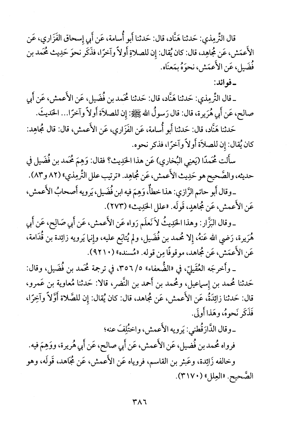 سألتُ محمدًا، يعني ابن إسماعيل البخاري، عن هذا الحديث؟ فقال: وهم محمد بن فضيل في حديثه، والصحيح هو حديث الأعمش، عن مجاهد. «ترتيب علل التِّرمِذي» (٨٢ و ٨٣).
