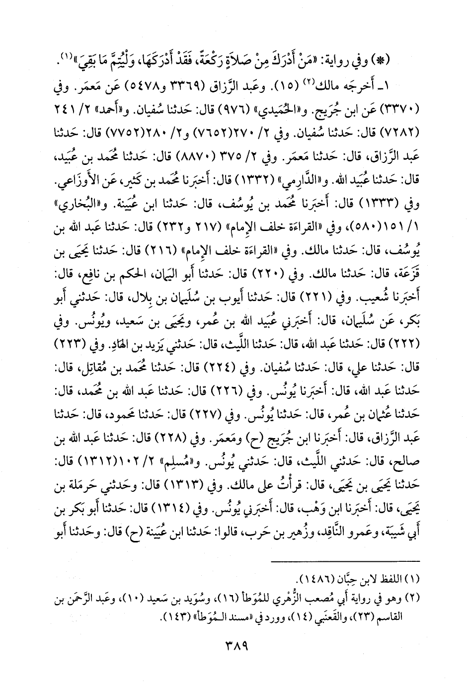 وفي «القراءة خلف الإمام» (٢١٦) قال: حدثنا يحيى بن قَزَعة، قال: حدثنا مالك. وفي (٢٢٠) قال: حدثنا أَبو اليمان الحكم بن نافع، قال: أخبرنا شعيب. وفي (٢٢٢) قال: حدثنا عبد الله، قال: حدثنا الليث، قال: حدثني يزيد بن الهاد. وفي (٢٢٣) قال: حدثنا علي، قال: حدثنا سفيان. وفي (٢٢٤) قال: حدثنا محمد بن مقاتل، قال: حدثنا عبد الله، قال: أخبرنا يونس. وفي (٢٢٦) قال: حدثنا عبد الله بن محمد، قال: حدثنا عثمان بن عمر، قال: حدثنا يونس. وفي (٢٢٧) قال: حدثنا محمود، قال: حدثنا عبد الرزاق، قال: أخبرنا ابن جُريج (ح) ومعمر. وفي (٢٢٨) قال: حدثنا عبد الله بن صالح، قال: حدثني الليث، قال: حدثني يونس. و «مسلم» ٢/ ١٠٢ (١٣١٢) قال: حدثنا يحيى بن يحيى، قال: قرأت على مالك. وفي (١٣١٣) قال: وحدثني حَرملة بن يحيى، قال: أخبرنا ابن وهب، قال: أخبرني يونس. وفي (١٣١٤) قال: حدثنا أَبو بكر بن أبي شيبة، وعَمرو الناقد، وزهير بن حرب، قالوا: حدثنا ابن عُيينة (ح) قال: وحدثنا أَبو