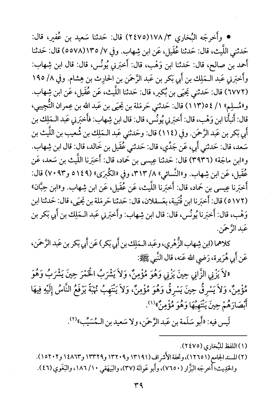 - وأخرجه البخاري ٣/ ١٣٦ (٢٤٧٥) قال: حدثنا سعيد بن عفير، قال: حدثني الليث، قال: حدثنا عُقيل، عن ابن شهاب. وفي ٧/ ١٠٤ (٥٥٧٨) قال: حدثنا أحمد بن صالح، قال: حدثنا ابن وهب، قال: أخبرني يونس، قال: قال ابن شهاب: وأخبرني عبد الملك بن أَبي بكر بن عبد الرَّحمَن بن الحارث بن هشام. وفي ٨/ ١٥٧ (٦٧٧٢) قال: حدثني يحيى بن بُكير، قال: حدثنا الليث، عن عُقيل، عن ابن شهاب. و «مسلم» ١/ ٥٤ (١١٣) قال: حدثني حَرملة بن يحيى بن عبد الله بن عمران التجيبي، قال: أنبأنا ابن وهب، قال: أخبرني يونس، قال: قال ابن شهاب: فأخبرني عبد الملك بن أَبي بكر بن عبد الرَّحمَن. وفي (١١٤) قال: وحدثني عبد الملك بن شعيب بن الليث بن سعد، قال: حدثني أبي، عن جدي، قال: حدثني عُقيل بن خالد، قال: قال ابن شهاب. و «ابن ماجة» (٣٩٣٦) قال: حدثنا عيسى بن حماد، قال: أخبرنا الليث بن سعد، عن عُقيل، عن ابن شهاب. و «النَّسَائي» ٨/ ٣١٣، وفي «الكبرى» (٥١٤٩ و ٧٠٩٣) قال: أخبرنا عيسى بن حماد، قال: أخبرنا الليث، عن عُقيل، عن ابن شهاب. و «ابن حِبَّان» (٥١٧٢) قال: أخبرنا ابن قتيبة، بعسقلان، قال: حدثنا حَرملة بن يحيى، قال: حدثنا ابن وهب، قال: أخبرنا يونس، قال: قال ابن شهاب: وأخبرني عبد الملك بن أَبي بكر بن عبد الرَّحمَن.