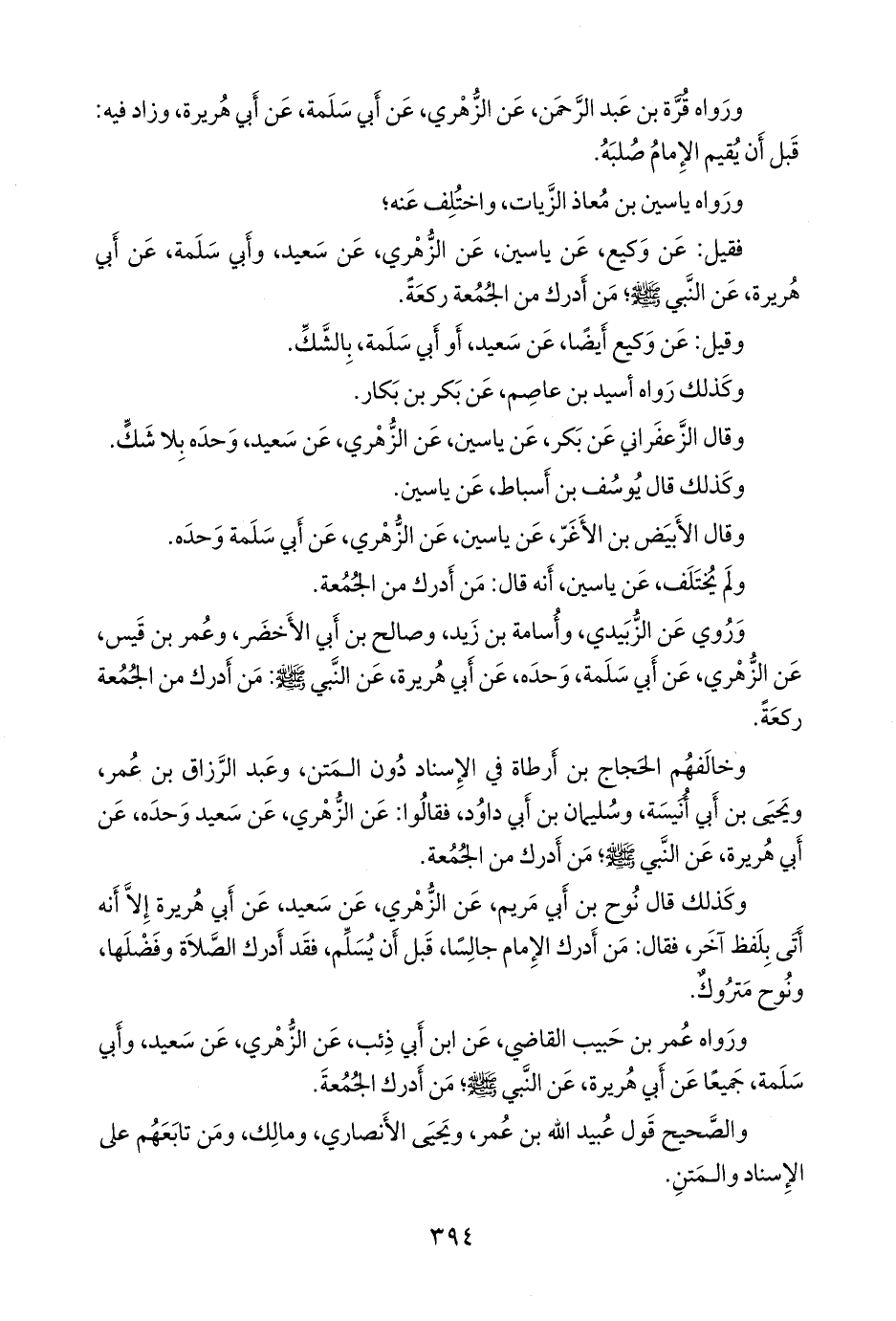 وروي عن الزبيدي، وأُسامة بن زيد، وصالح بن أبي الأخضر، وعمر بن قيس، عن الزُّهْري، عن أبي سلمة، وحده، عن أبي هريرة، عن النبي صَلى الله عَليه وسَلم؛ من أدرك من الجمعة ركعة.