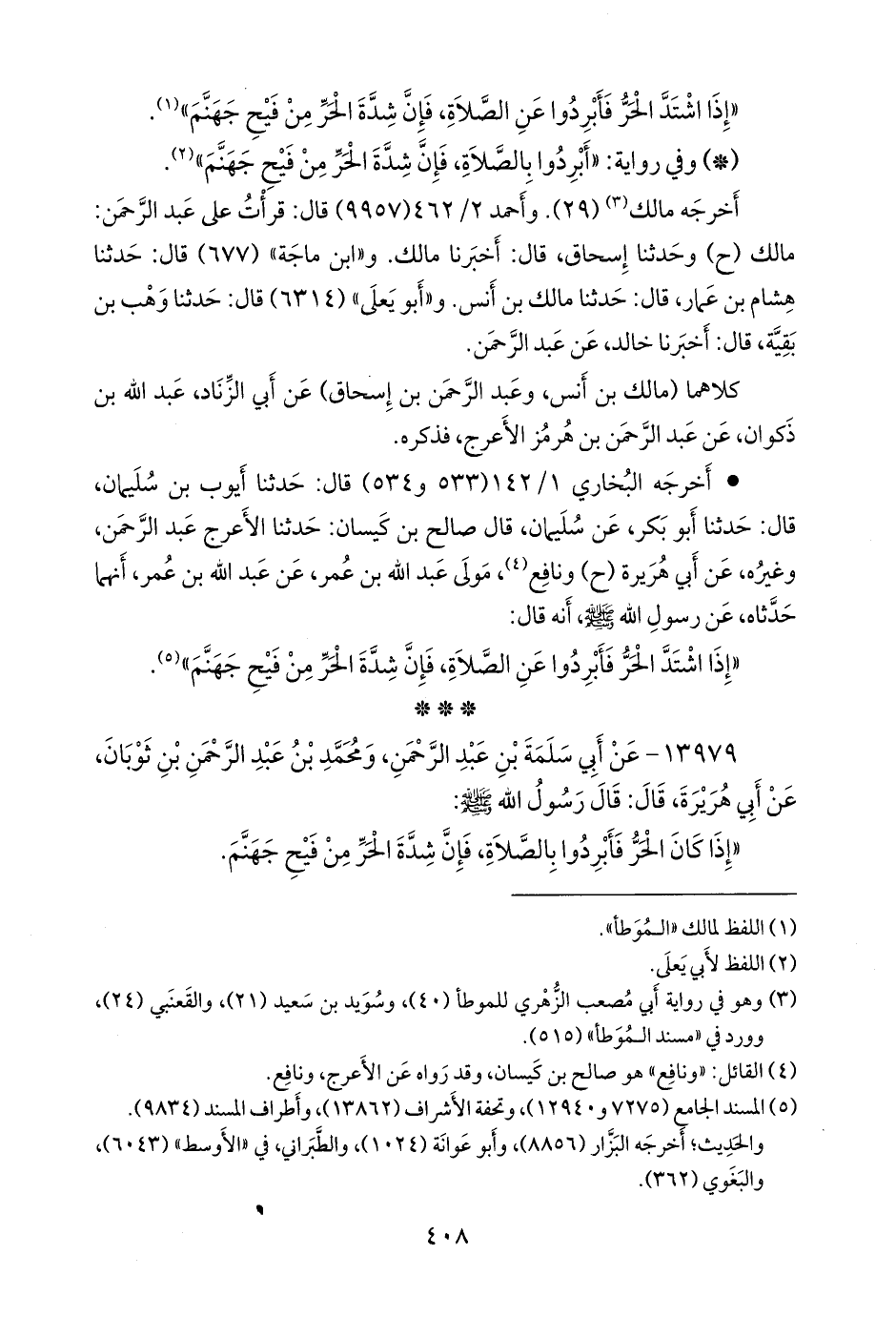 - وفي رواية: «إِذا اشتد الحر فأَبردوا عن الصلاة، فإِن شدة الحر من فيح جهنم» (٢).
