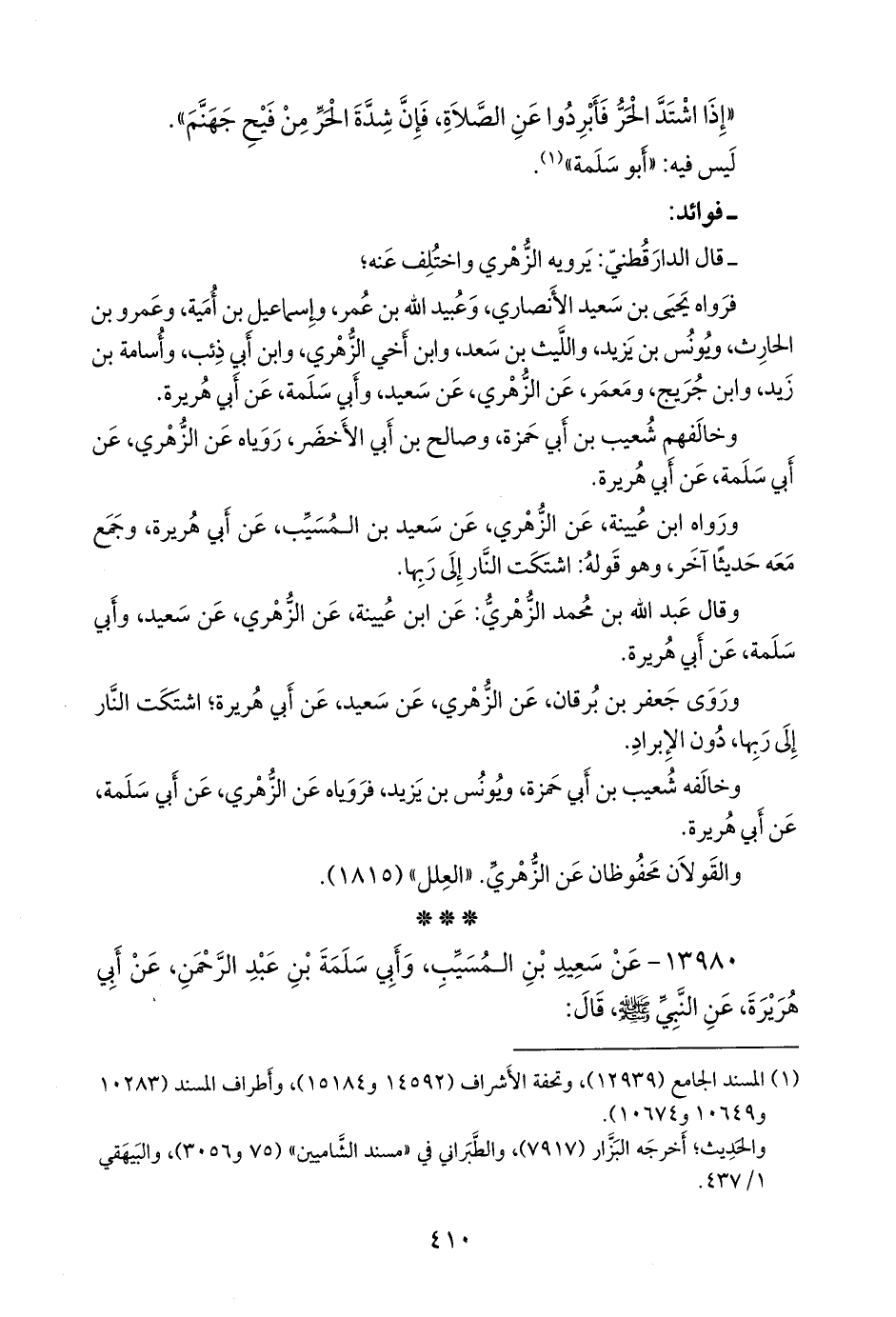 - سئل الدَّارقُطني عن حديث سعيد، وأَبي سلمة، عن أَبي هريرة، قال رسول الله صَلى الله عَليه وسَلم: أَبردوا بالظهر فإِن شدة الحر من فيح جهنم.