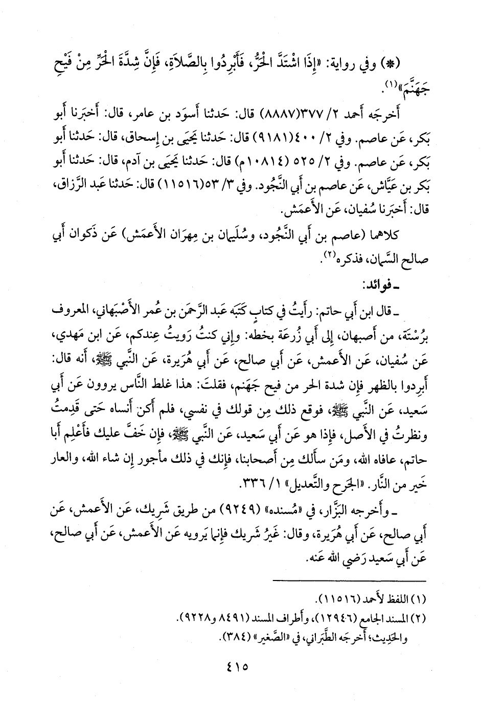 - قال عبد الرَّحمَن بن أبي حاتم الرازي: رأيت في كتاب كتبه عبد الرَّحمَن بن عمر الأصبهاني، المعروف برستة، من أصبهان، إلى أَبي زُرعَة بخطه: وإني كنت رويت عندكم، عن ابن مهدي، عن سفيان، عن الأعمش، عن أبي صالح، عن أبي هريرة، عن النبي صَلى الله عَليه وسَلم أنه قال: أبردوا بالظهر فإن شدة الحر من فيح جهنم، فقلت: هذا غلط الناس يروون عن أبي سعيد، عن النبي صَلى الله عَليه وسَلم فوقع ذلك من قولك في نفسي، فلم أكن أنساه حتى قدمت ونظرت في الأصل، فإذا هو عن أبي سعيد، عن النبي صَلى الله عَليه وسَلم فإن خف عليك فأعلم أبا حاتم، عافاه الله، ومن سألك من أصحابنا، فإنك في ذلك مأجور إن شاء الله، والعار خير من النار. «الجرح والتعديل» ١/ ٣٣٦.