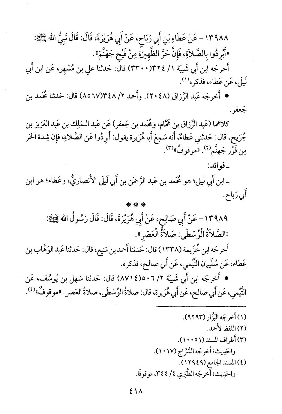 كلاهما (عبد الرزاق بن همام، ومحمد بن جعفر) عن عبد الملك بن عبد العزيز بن جُريج، قال: حدثني عطاء، أنه سمع أبا هريرة يقول: أبردوا عن الصلاة، فإن شدة الحر من فور جهنم (¬٢). «موقوف» (¬٣).
