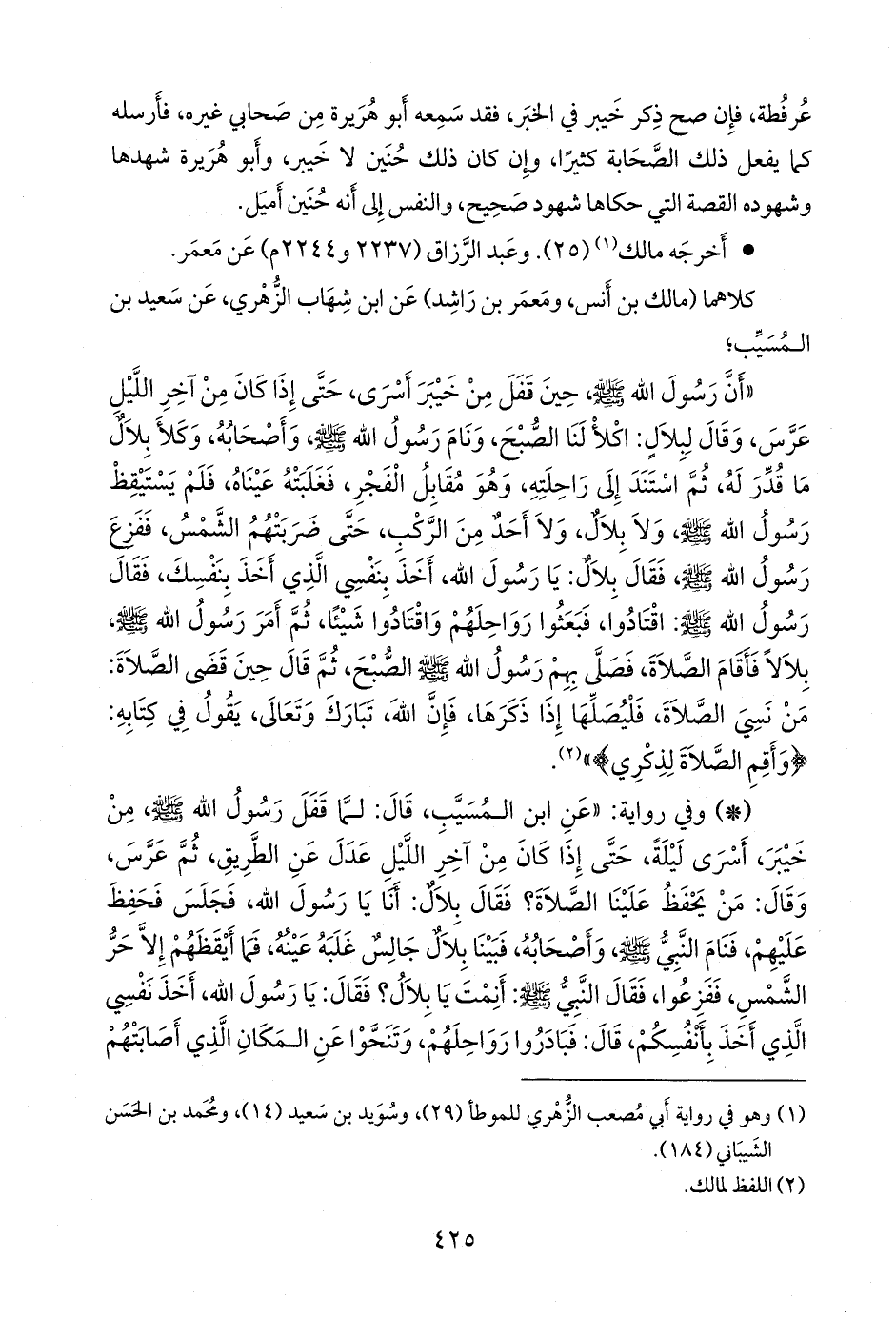 - وفي رواية: «عن ابن المُسَيب، قال: لما قفل رسول الله صَلى الله عَليه وسَلم من خيبر، أسرى ليلة، حتى إذا كان من آخر الليل عدل عن الطريق، ثم عرس، وقال: من يحفظ علينا الصلاة؟ فقال بلال: أنا يا رسول الله، فجلس فحفظ عليهم، فنام النبي صَلى الله عَليه وسَلم وأصحابه، فبينا بلال جالس غلبه عينه، فما أيقظهم إلا حر الشمس، ففزعوا، فقال النبي صَلى الله عَليه وسَلم: أنمت يا بلال؟ فقال: يا رسول الله، أخذ نفسي الذي أخذ بأنفسكم، قال: فبادروا رواحلهم، وتنحوا عن المكان الذي أصابتهم