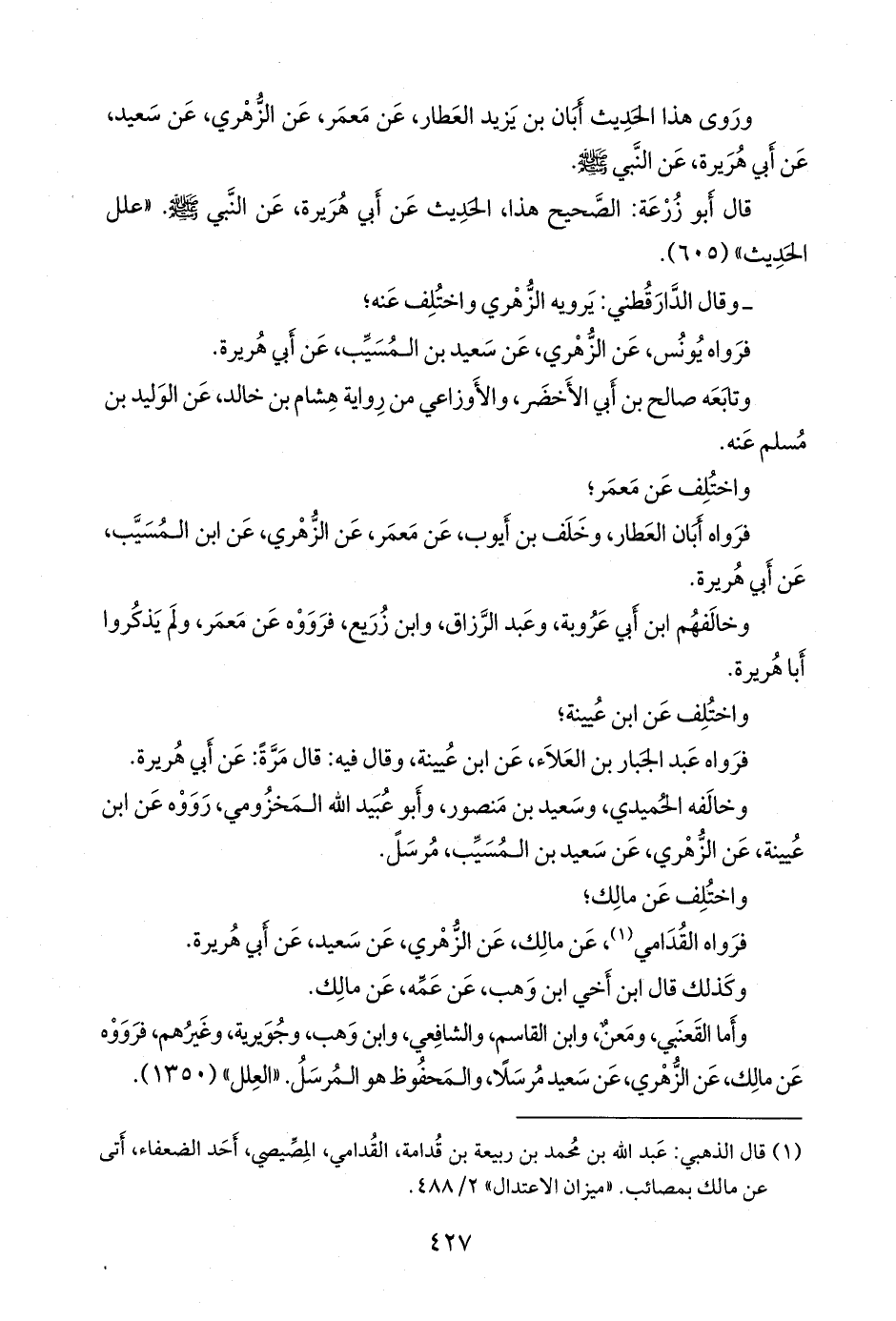 وأما القَعنَبي، ومعن، وابن القاسم، والشافعي، وابن وهب، وجويرية، وغيرهم، فرووه عن مالك، عن الزُّهْري، عن سعيد مرسلا، والمحفوظ هو المرسل. «العلل» (١٣٥٠)