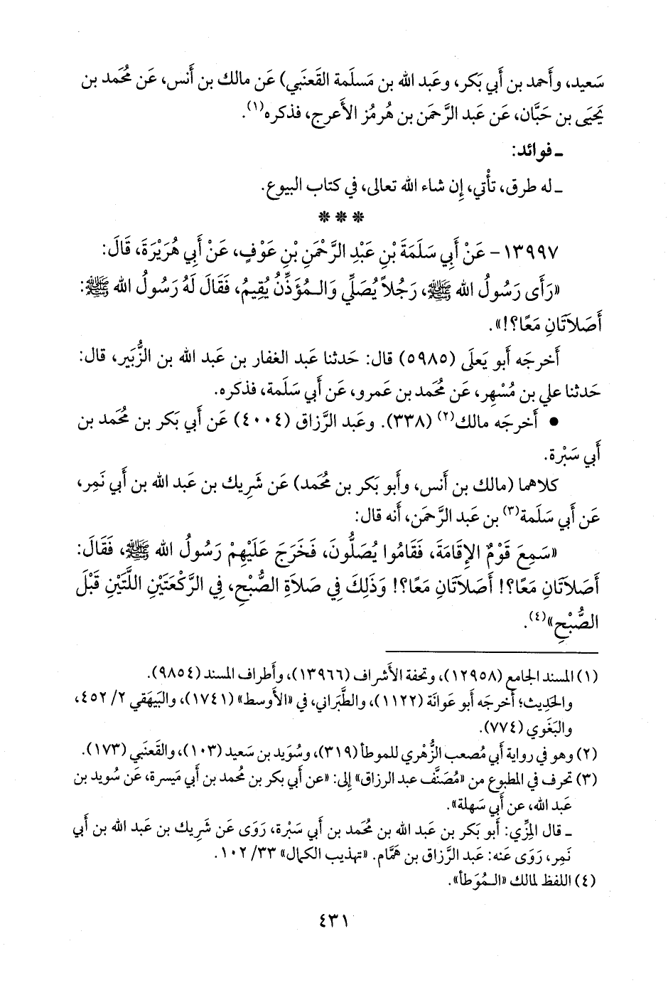 - وفي رواية: «خرج رسول الله صَلى الله عَليه وسَلم والمؤذن يقيم، فصلى الفجر، فوجد رجلين يصليان، فقال: أصلاتان معا؟». «مُرسَل» (¬٤).