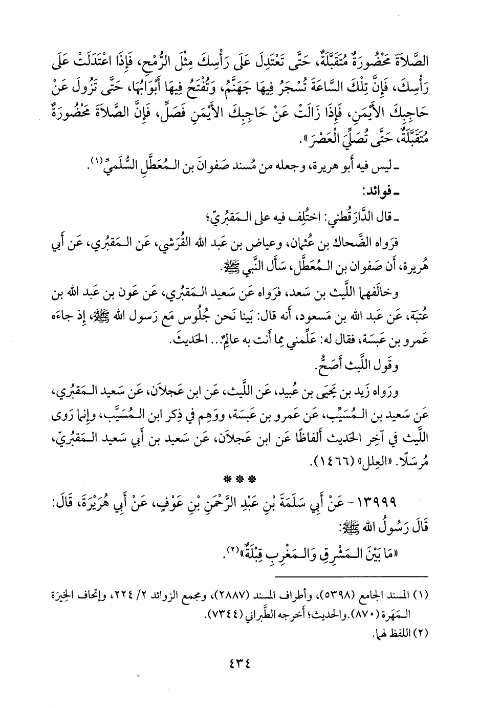 ورواه زيد بن يحيى بن عبيد، عن الليث، عن ابن عَجلان، عن سعيد المَقبُري، عن سعيد بن المُسَيب، عن عَمرو بن عبسة، ووهم في ذكر ابن المُسَيب، وإنما روى الليث في آخر الحديث ألفاظا عن ابن عَجلان، عن سعيد بن أبي سعيد المَقبُري، مُرسلًا. «العلل» (١٤٦٦).