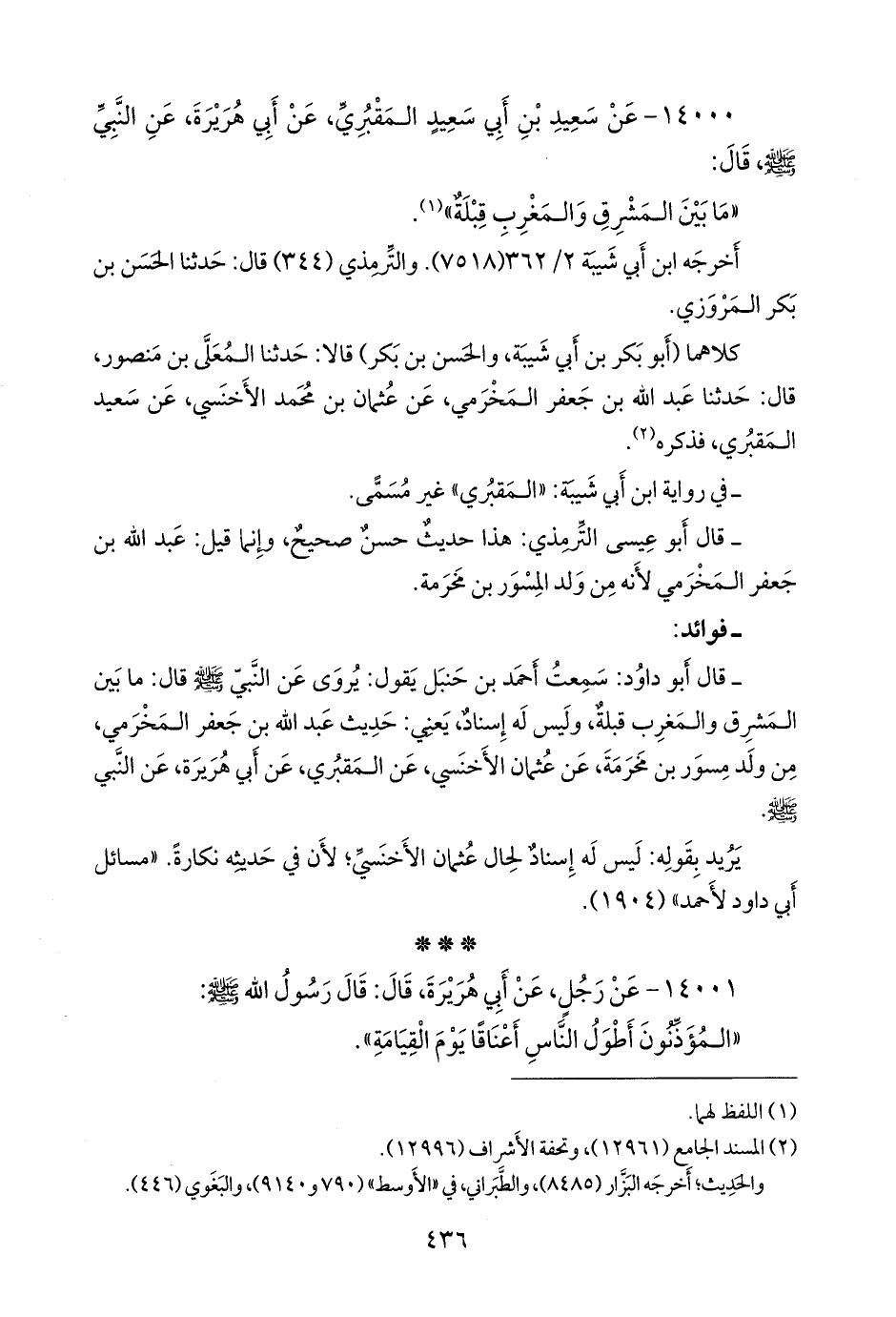 - قال أَبو داود: سمعت أحمد بن حنبل يقول: يروى عن النبي صَلى الله عَليه وسَلم قال: ما بين المشرق والمغرب قبلة، وليس له إسناد، يعني: حديث عبد الله بن جعفر المخرمي، من ولد مسور بن مخرمة، عن عثمان الأخنسي، عن المَقبُري، عن أبي هريرة، عن النبي صَلى الله عَليه وسَلم.