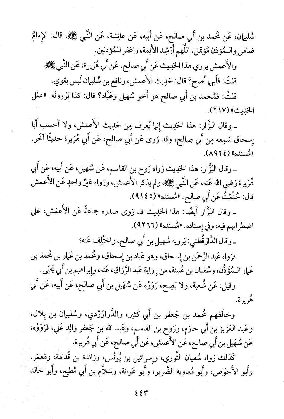 وخالفهم محمد بن جعفر بن أبي كثير، والدراوَرْدي، وسليمان بن بلال، وعبد العزيز بن أبي حازم، وروح بن القاسم، وعبد الله بن جعفر والد علي، فرووه، عن سهيل بن أبي صالح، عن الأعمش، عن أبي صالح، عن أبي هريرة.