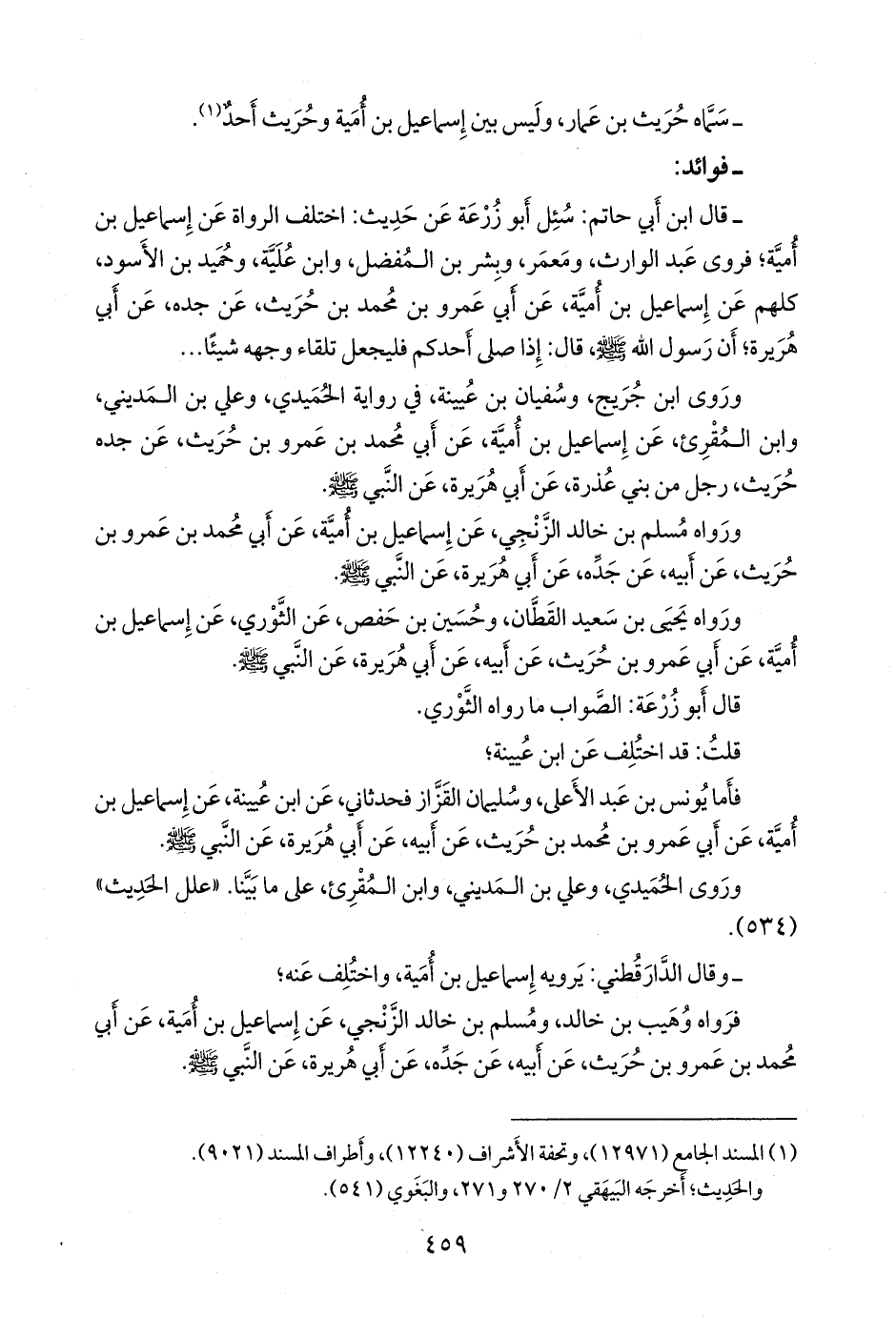 - قال عبد الرَّحمَن بن أبي حاتم الرازي: سئل أَبو زُرعَة عن حديث: اختلف الرواة عن إسماعيل بن أُمية؛ فروى عبد الوارث، ومعمر، وبشر بن المُفَضَّل، وابن عُلَية، وحميد بن الأسود، كلهم عن إسماعيل بن أُمية، عن أبي عَمرو بن محمد بن حريث، عن جَدِّه، عن أبي هريرة؛ أن رسول الله صَلى الله عَليه وسَلم قال: إذا صلى أحدكم فليجعل تلقاء وجهه شيئا ...