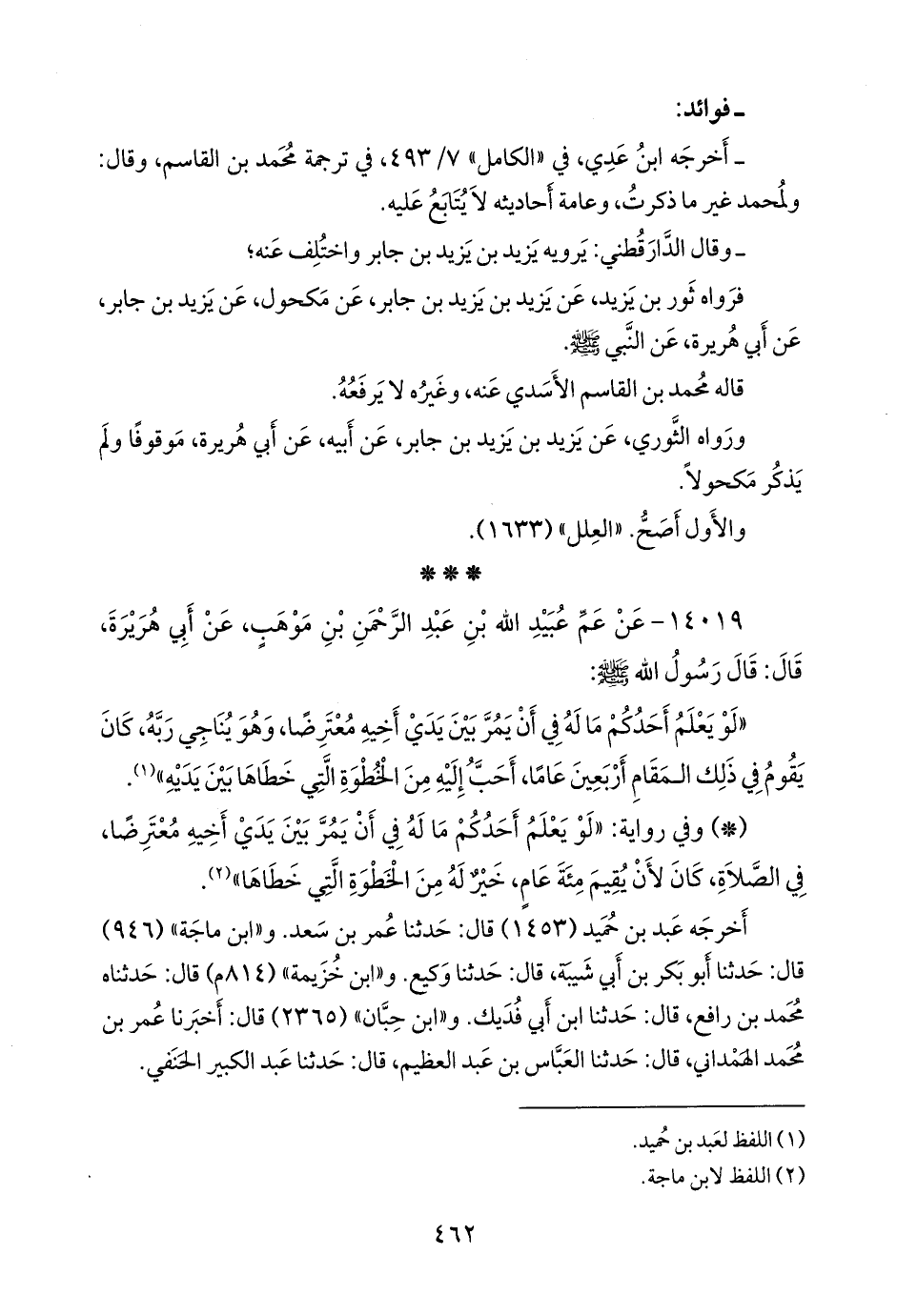 - وفي رواية: «لو يعلم أحدكم ما له في أن يمر بين يدي أخيه معترضا، في الصلاة، كان لأن يقيم مئة عام، خير له من الخطوة التي خطاها» (¬٢).