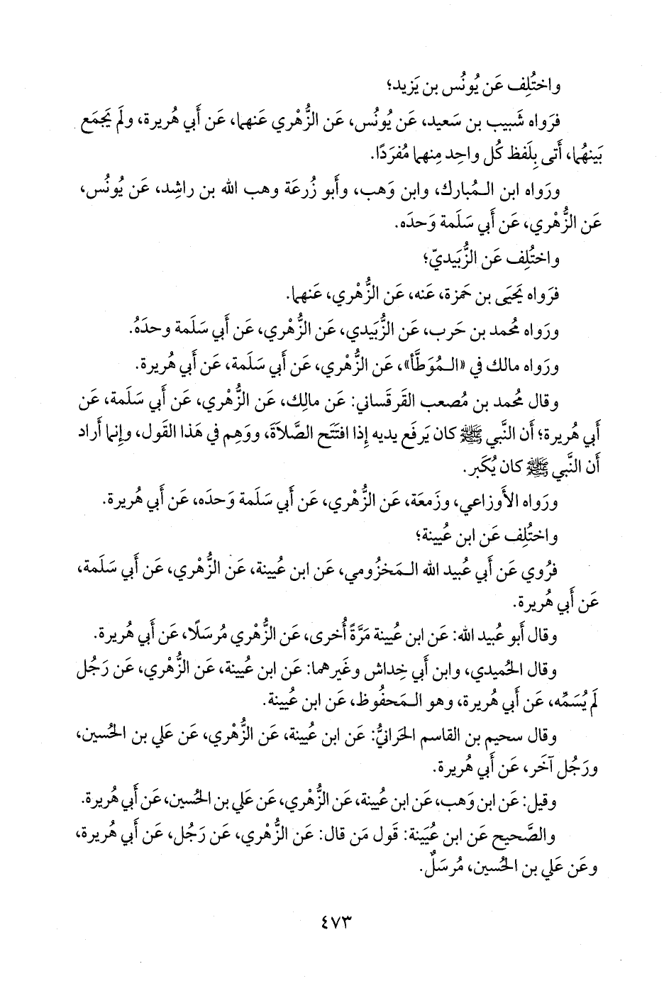 وخالفه يحيى بن أيوب، وعثمان بن الحكم الجذامي، فروياه عن ابن جُريج، عن الزُّهْري، عن أَبي بكر بن عبد الرَّحمَن، عن أبي هريرة؛ كان رسول الله صَلى الله عَليه وسَلم إذا افتتح الصلاة كبر ورفع يديه حذو منكبيه، وإذا أراد الركوع رفعهما، وإذا رفع رأسه من الركوع رفعهما، وإذا قام من الركعة الثالثة بعد التشهد.