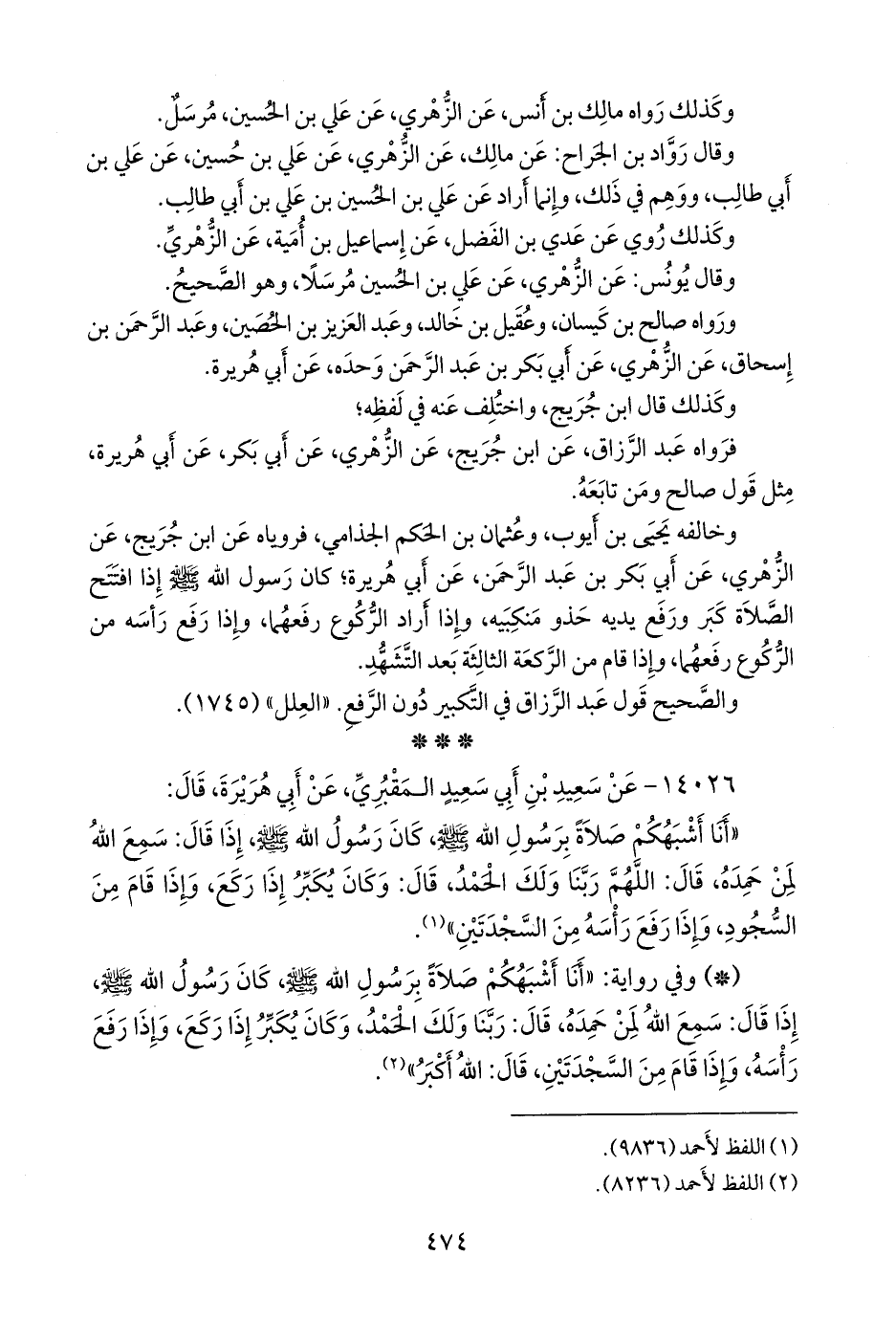 «أنا أشبهكم صلاة برسول الله صَلى الله عَليه وسَلم كان رسول الله صَلى الله عَليه وسَلم إذا قال: سمع الله لمن حمده، قال: اللهم ربنا ولك الحمد، قال: وكان يكبر إذا ركع، وإذا قام من السجود، وإذا رفع رأسه من السجدتين» (¬١).