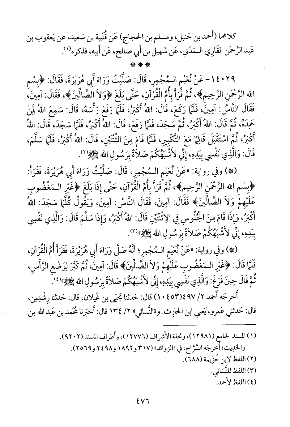 - وفي رواية: «عن نعيم المجمر؛ أنه صلى وراء أبي هريرة، فقرأ أم القرآن، فلما قال: {غير المغضوب عليهم ولا الضالين} قال: آمين، ثم كبر لوضع الراس، ثم قال حين فرغ: والذي نفسي بيده، إني لأشبهكم صلاة برسول الله صَلى الله عَليه وسَلم» (¬٣).
